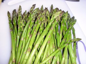 When almost cooked completely, leftover aged sharp cheddar cheese, grated and sprinkled over half the omelet before adding the asparagus, folding over and heating through till cheese is melted, then serving up hot with buttered multi-grain toast.