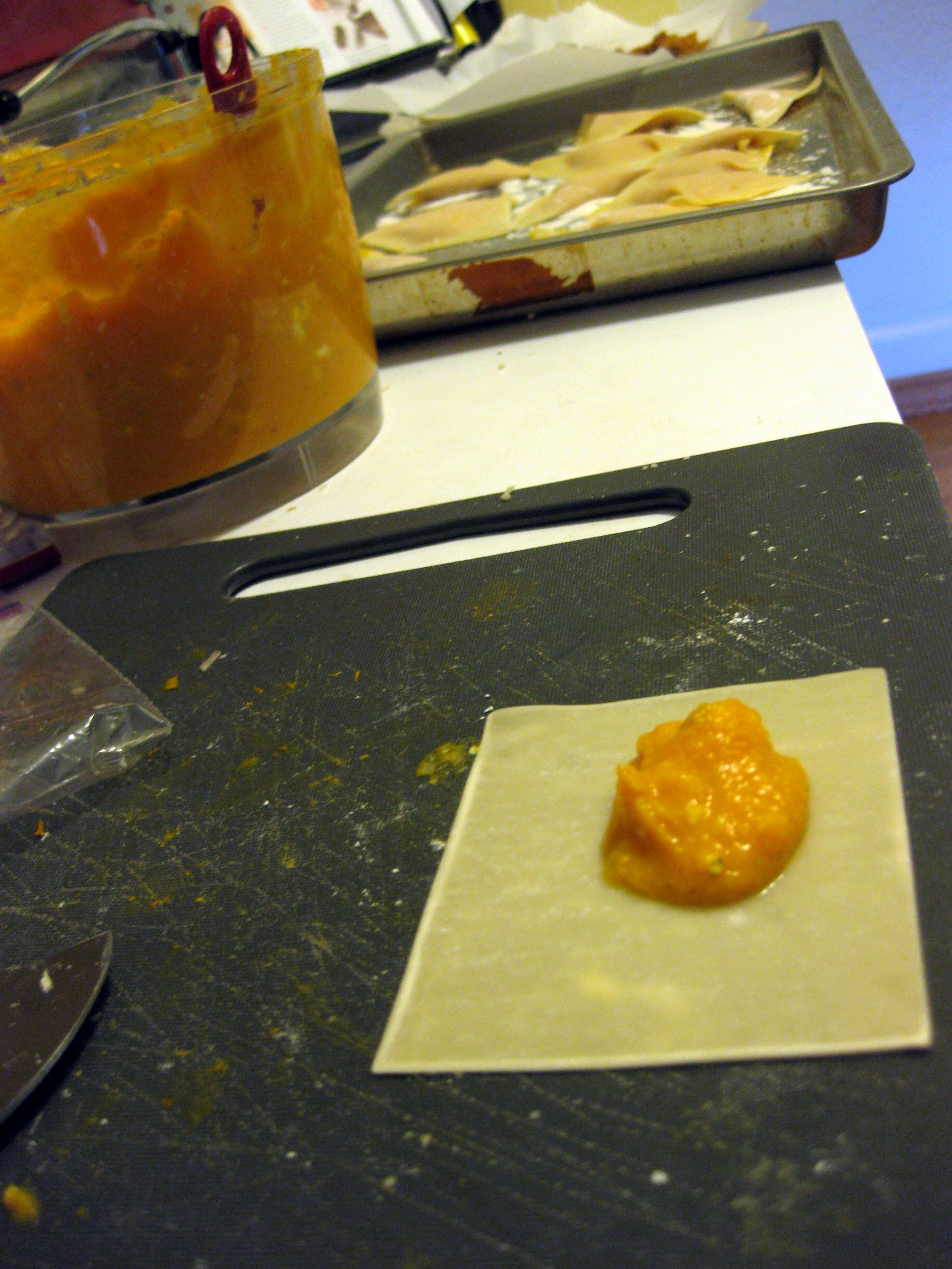 When the filling is cooled, you can address containment. Though you could certainly make your own fresh pasta, or maybe even stuff large shells or manicotti, I addressed a package of square wonton wrappers.