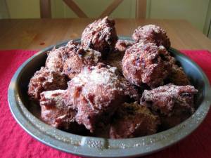 They were more fritters than donuts, really, but that’s close enough. Simple batter: egg, milk, sugar, flour, baking powder, cinnamon. And to add something special, a spare ½ cup of defrosted cranberries, barely pulsed in the food processor. No rolling, no cutting, no kneading, just tablespoon-fuls of this chewy, sticky batter into a pot of hot vegetable oil. I came close to disaster several times, because the batter was so sticky that it didn’t want to come off the spoon. The problem here, of course, is that resistance leads to increasingly vigorous shaking, which means when the fritter finally disengages, it hits the oil with a resounding, gut-wrenching plunk that means you will end up with finger confit if you don’t step back very, very quickly.