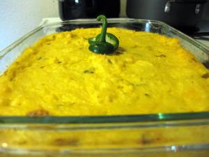 Out of the oven, this casserole was tremendous looking. The top browned and crusted and gained some topography as not-quite-smooth sections became crannies and crevices. Under this slight crunch of an exterior, the inside sliced through like fresh mozzarella: moist, creamy, a little firm. On the palate, it was tremendous tasting. It was cheesy and spongy with bits of crispness, and a heat that hit the tongue and the back of the throat, not during the chewing process, but after the bite was swallowed and you thought you were safe. Just a pleasant heat, easily washed down with luscious, buttery tender chunks of pot roast and a good dark beer.