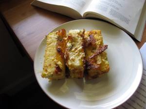 As good as it was fresh out of the oven, I admit that my reasons for making this dish again so soon after our party were really all about the leftovers. What’s better than jalapeno cheese grits casserole, steaming and flecked with chiles and strings of cheese? Jalapeno cheese grits casserole cut into fingers just out of the refrigerator, and fried in a pan of sizzling butter. Yes, I fried them.