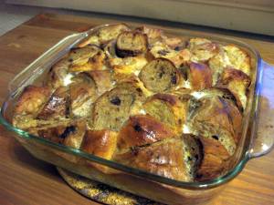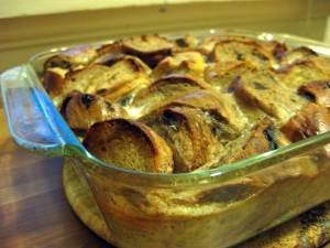 Thanks to the cinnamon, the pumpkin pie spice, and the rum, after about twenty minutes our house filled with that holiday-season smell. You know what I mean. After 45 minutes, I peeked in the oven and saw that the top pieces, the edges that poked out over the custard, were dark brown and crispy, and when I touched them lightly the whole beautiful pudding jiggled slightly and then sprang back into shape after my touch. The top had puffed up as the eggs cooked and expanded, and when I took it out of the oven I could hear it hissing and whining softly as air released.