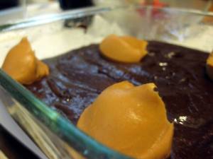 As brownies go, it was a fairly standard procedure of careful melting, mixing, swirling, baking, but oh the delight of tasting!  In the short section about the recipe preceding the ingredient list, the words “Reese’s Peanut Butter Cup” appear.  They aren’t kidding.  With the peanut butter swirled gently into the deep chocolate batter (and there is no other word for the color than that: chocolate) and my fingers cautiously tasting stray blobs of batter, I wanted to stop and eat the batter.  Half of it would bake up just as nicely as the whole pan, right?