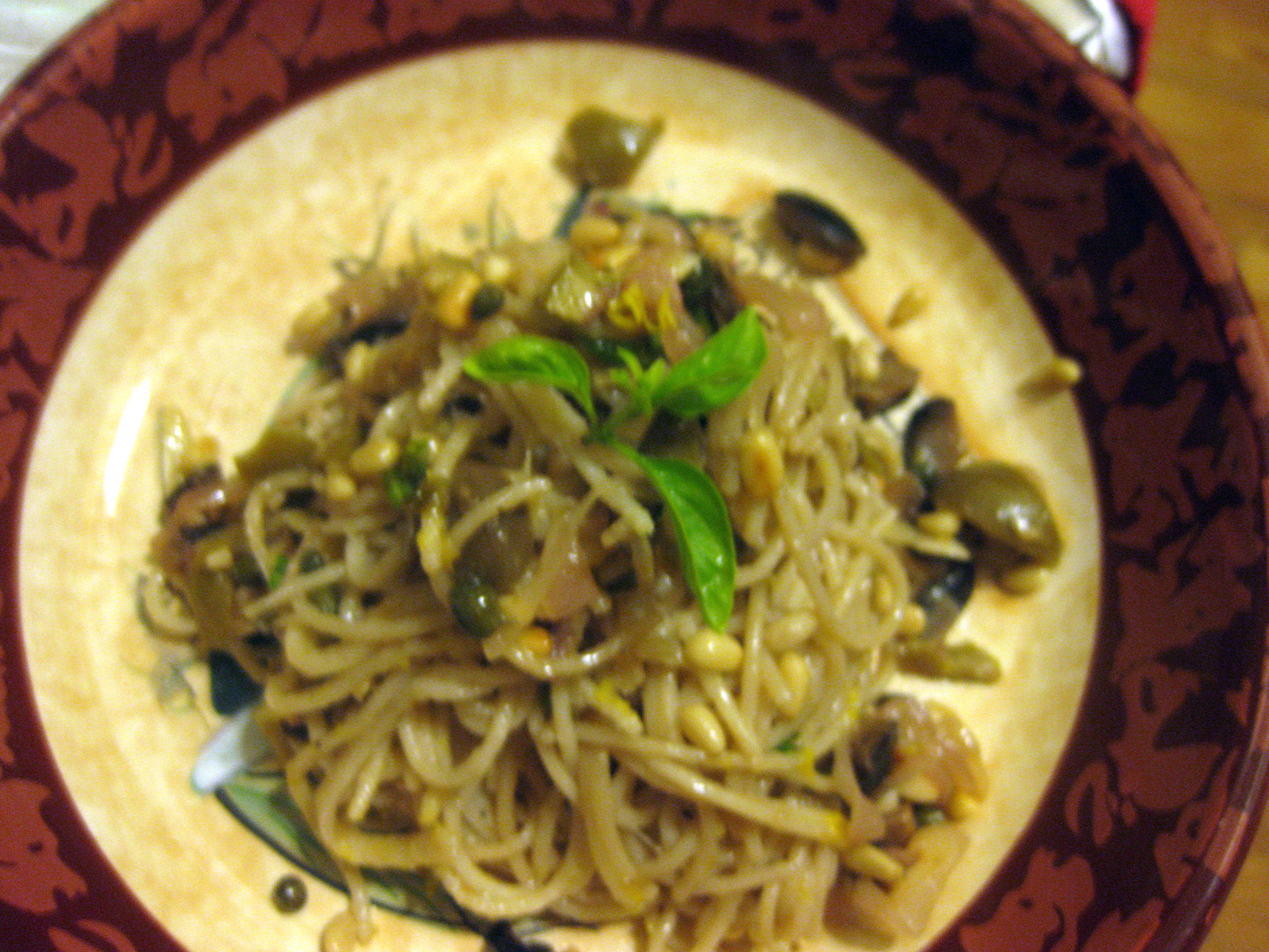 With the toasty, nutty perfume of not-quite-burned pine nuts still lingering in the kitchen, I sautéed a collection of vegetables in my biggest skillet, hurriedly chopping and slicing in between stirring sessions.  I’m always too anxious to cook to bother readying all my mise en place before scraping a boardful of ingredients into the pan.  At the point that the roughly chopped mix of olives I’d kept stowed in the back of my fridge and the finely chopped little fillets of anchovy hit the pan, I felt my knees buckle.  The smell was incredible.  When I added capers and lemon juice, I had a Proustian epiphany of Corsica, of Greece, of Spain.  Except I’ve never been to Spain.  Or Corsica.  Or anywhere in Greece.  It was just a strong enough, rich enough, delicious enough smell that it lifted me from the stained hardwood floor of my kitchen and transported me onto some magical different plane of Mediterranean glory.