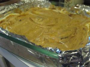 While the flavor was great, it did read more like a layered dessert than a brownie. I think this is because I used the full amount of cream cheese mix Dave Lebovitz calls for PLUS a cup of pumpkin puree. There was just too much goodness to swirl evenly. My proposed solution to this is to layer half the chocolate, then dollop on the cream cheese and pumpkin, then top it with the other half of the chocolate batter before mixing. It seems it will be easier to swirl together the much denser, thicker chocolate with the delicate creaminess of the additional flavors if the chocolate is divided up.