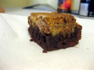 I resisted, and when the collection of smells had solidified into a… well… a thing from which an inserted toothpick came out clean, I set it aside on the counter to cool. It was truly a frankensteinian creation. The brownie layer was dark and rich and barely disturbed, while the top was a delicate whipped pale orange that cut like a harvest-flavored mousse.