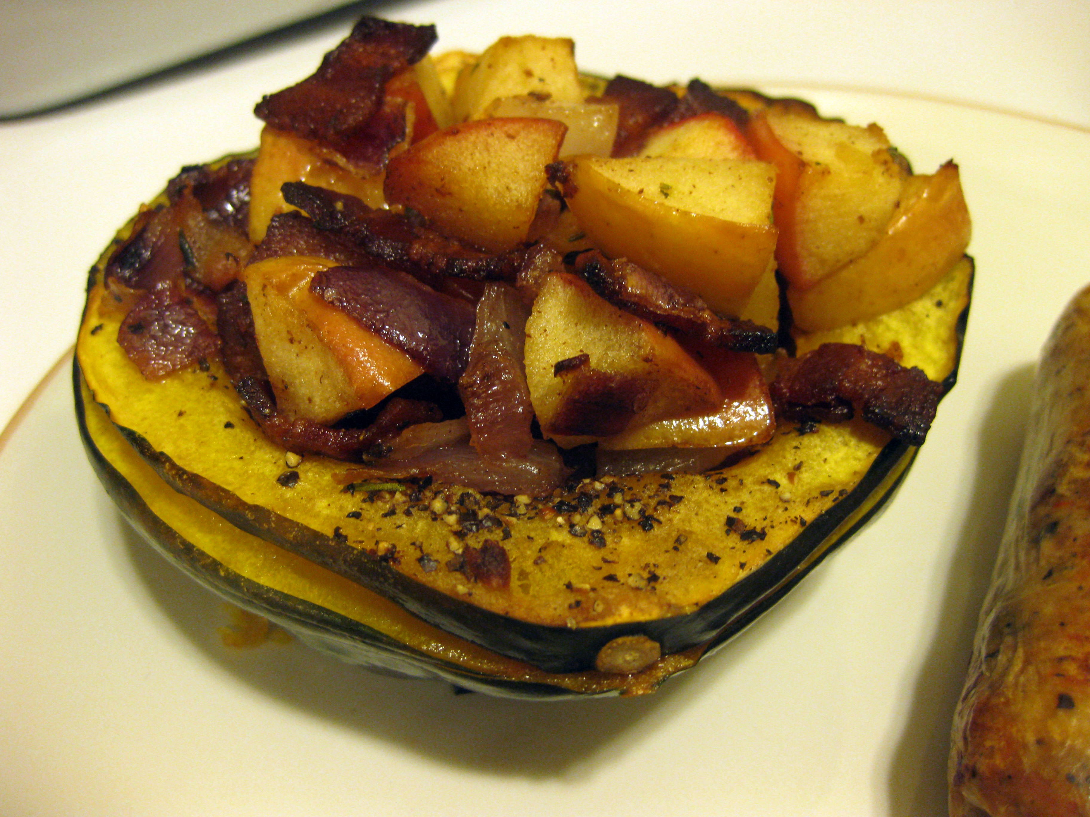 “45. Render some chopped bacon in a bit of oil, then add apple chunks; cook until nearly soft. Meanwhile, bake halved and seeded acorn, butternut, or delicata squash until they start to soften. Fill squash with apple mixture and finish baking.”