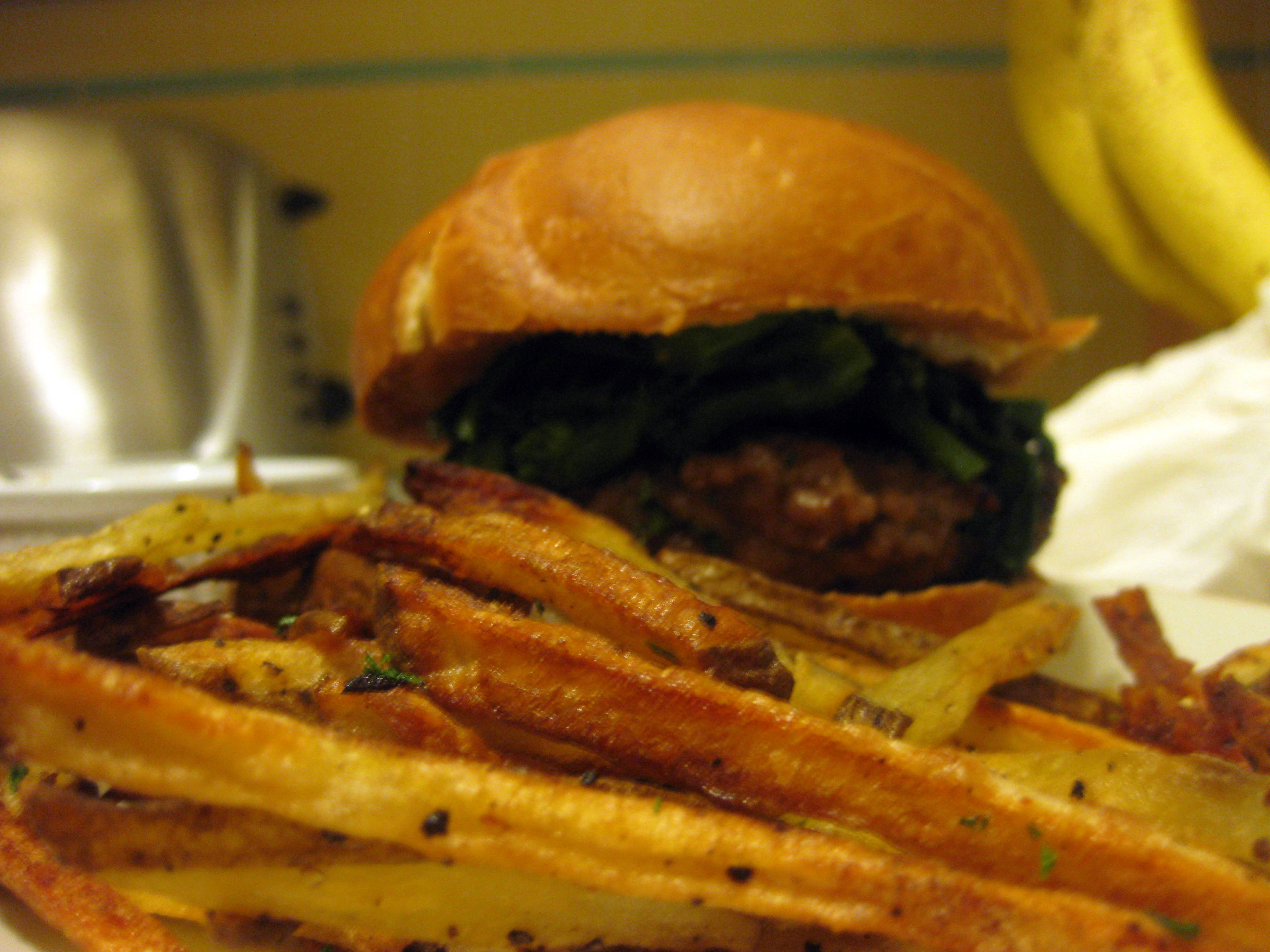These were really, really good. The garlic and the ginger gave the burgers a bright, mouth-warming zing. I’m not going to say they made the burgers spicy because that’s not the right word, but they definitely upped the excitement of the sausage and gave it a new flair. The black bean sauce added salty umami saliva-inspiring richness so that I didn’t miss the cheese I usually can’t be without. The broccoli rabe cut the rich saltiness of the burger with its bitter notes, which meant a lovely duel of flavors across my tongue. The french fry accompaniment was a delightful treat – they were crunchy and crisp but starchy and light inside. The salt, garlic and parsley were bright bursts of freshness I wanted to lap up even after the fries were gone, and the sauce was a pleasant way of tying them in with the flavor profile of the burgers.