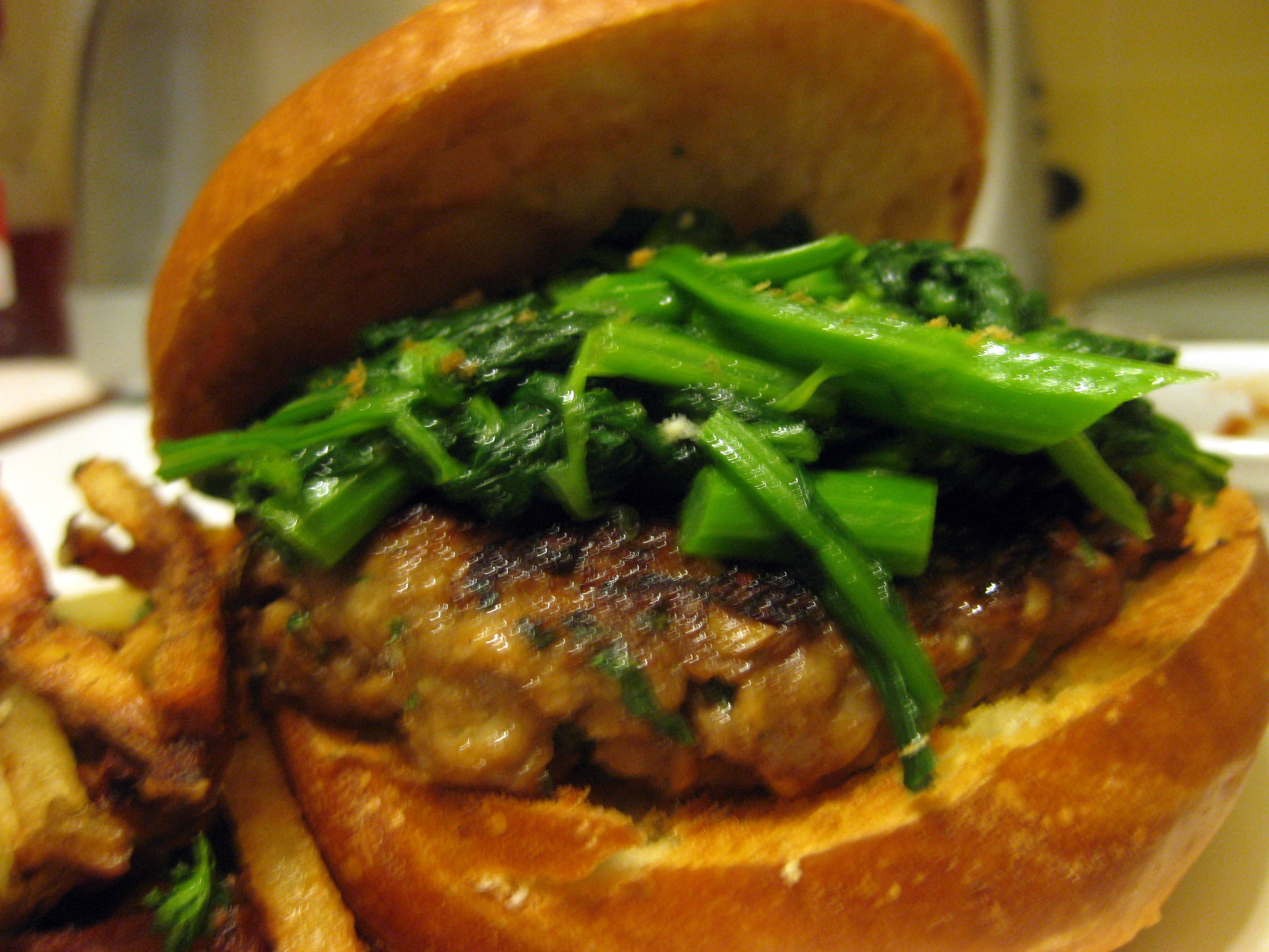 Mix all ingredients except the broccoli rabe gently in a medium bowl with a fork or with your hands. Press into two patties slightly wider in circumference than the buns you will be using. I made them fairly thin so they would cook faster.