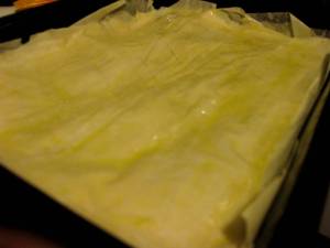 I forgot to snap a shot of the filling before tucking it in, but the fully constructed “pie” was lovely. I opted not to fold under all the edges after layering up in a baking dish, because I love that crunchy paper-thin crispness exposed edges of phyllo take on in the oven. Messy sheets are not always a bad thing.