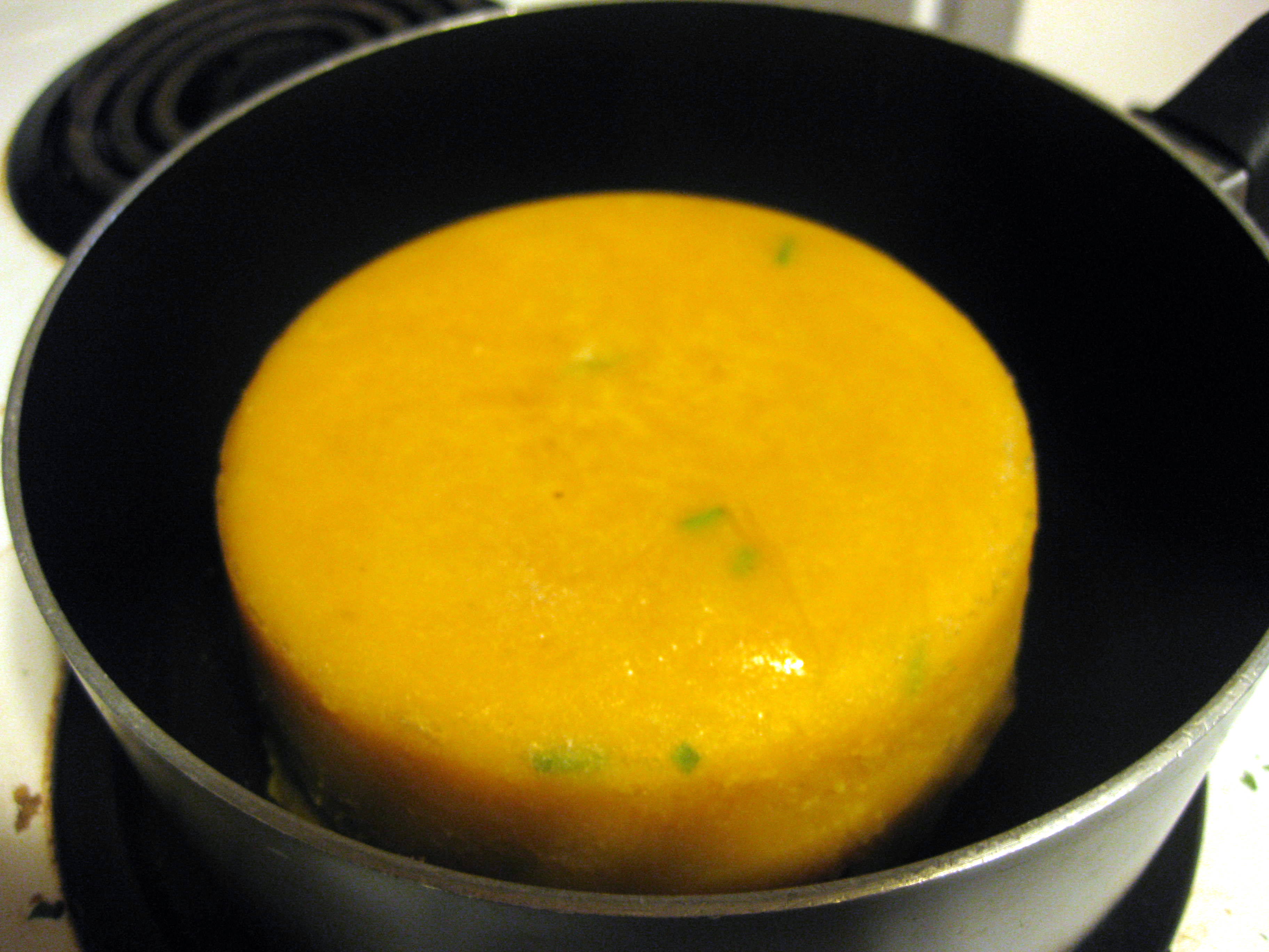 To contrast the green and soft matte golden brown of the spanakopita, I turned to a frozen friend: butternut squash soup from this fall, which we’d consumed half of and stashed away the remainder for a lazier day. I plunked the solid orange disk into a pot and added a splash of roasted garlic-infused chicken broth to loosen it up a little (the original batch had been more like a puree than a soup). Then I left it to its own devices on medium low until sluggish bubbles were forming and the spanakopita was golden and done.