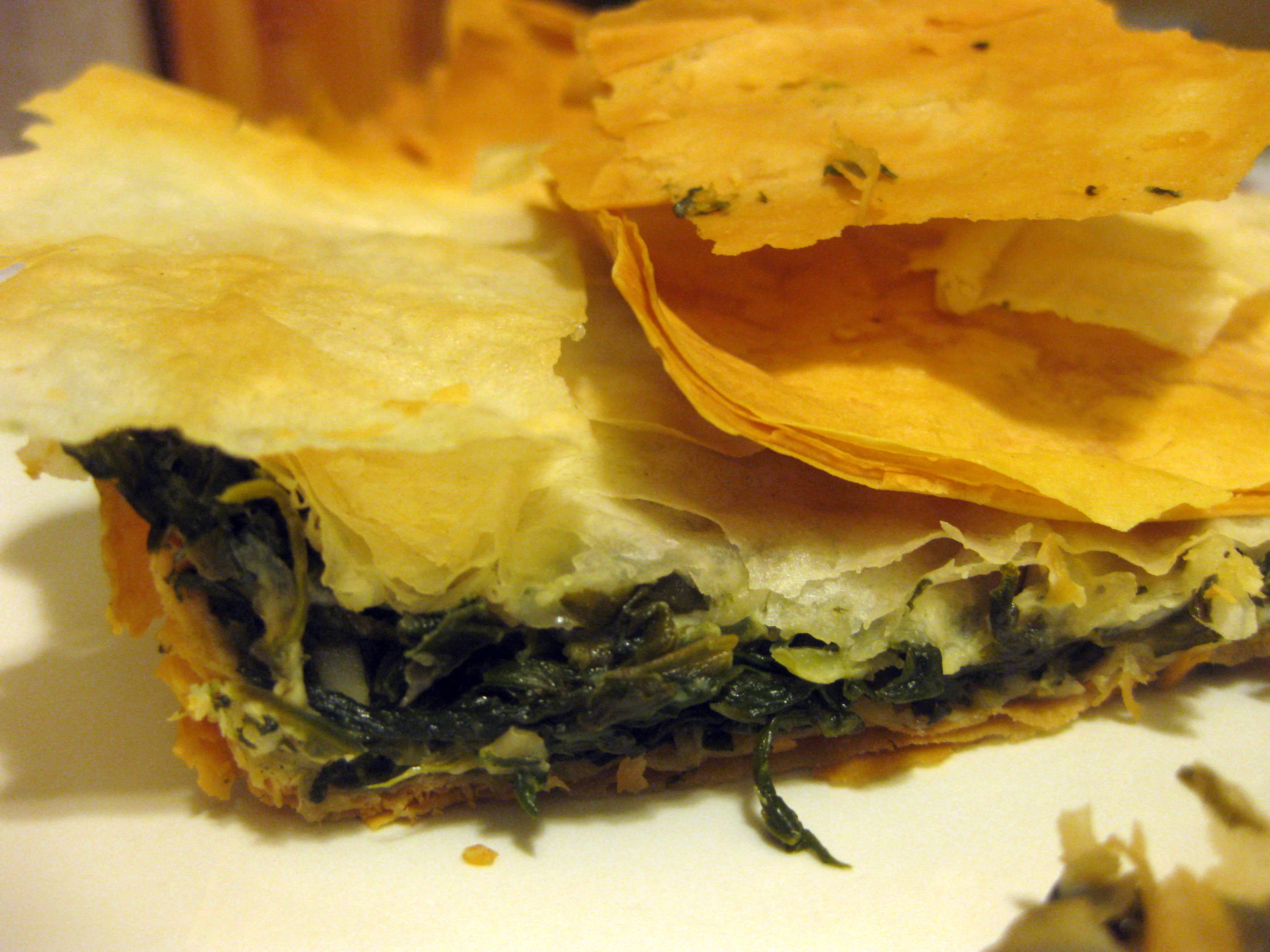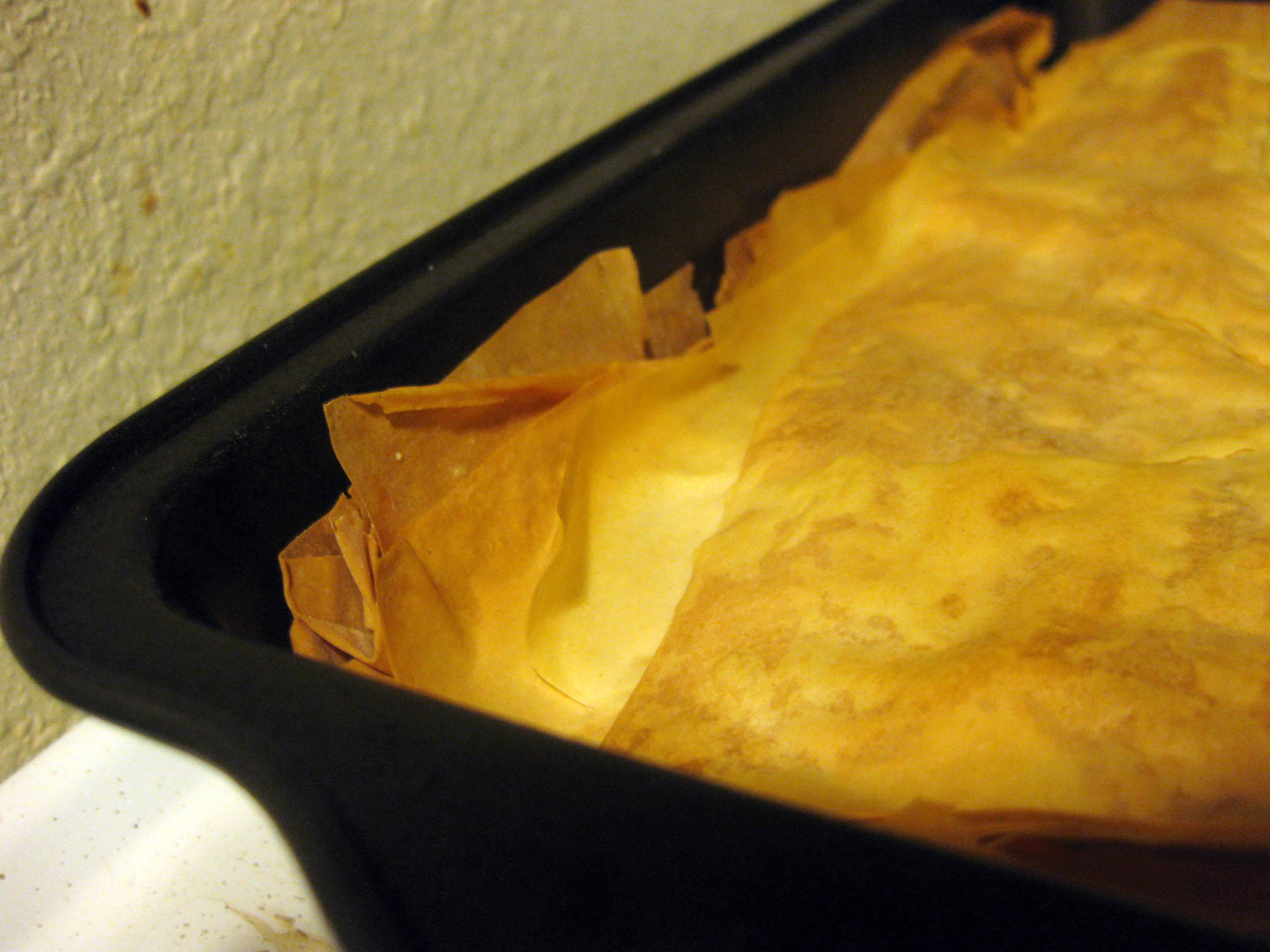 This is basically spanakopita, so I knew from the beginning it would be good. With the addition of 3-4 thinly sliced green onions and liberal seasoning of salt and pepper in my spinach, I followed this unusually precise almost-recipe to the letter. Here’s what I used: