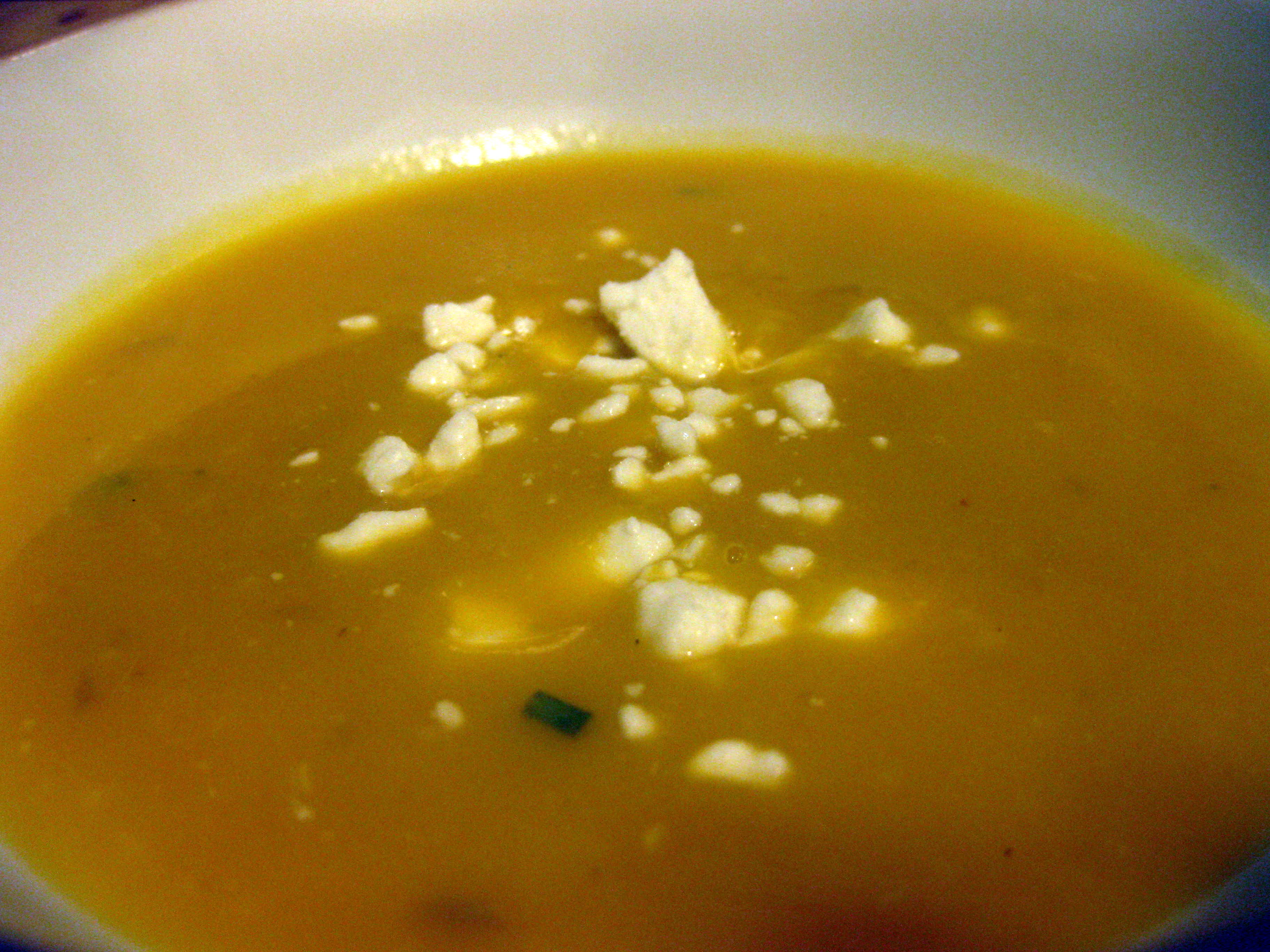 The feta was so good in the spanakopita itself that I thought it would make a nice topping for the soup, brightening the slow comforting sweetness of the squash and potato mixture.