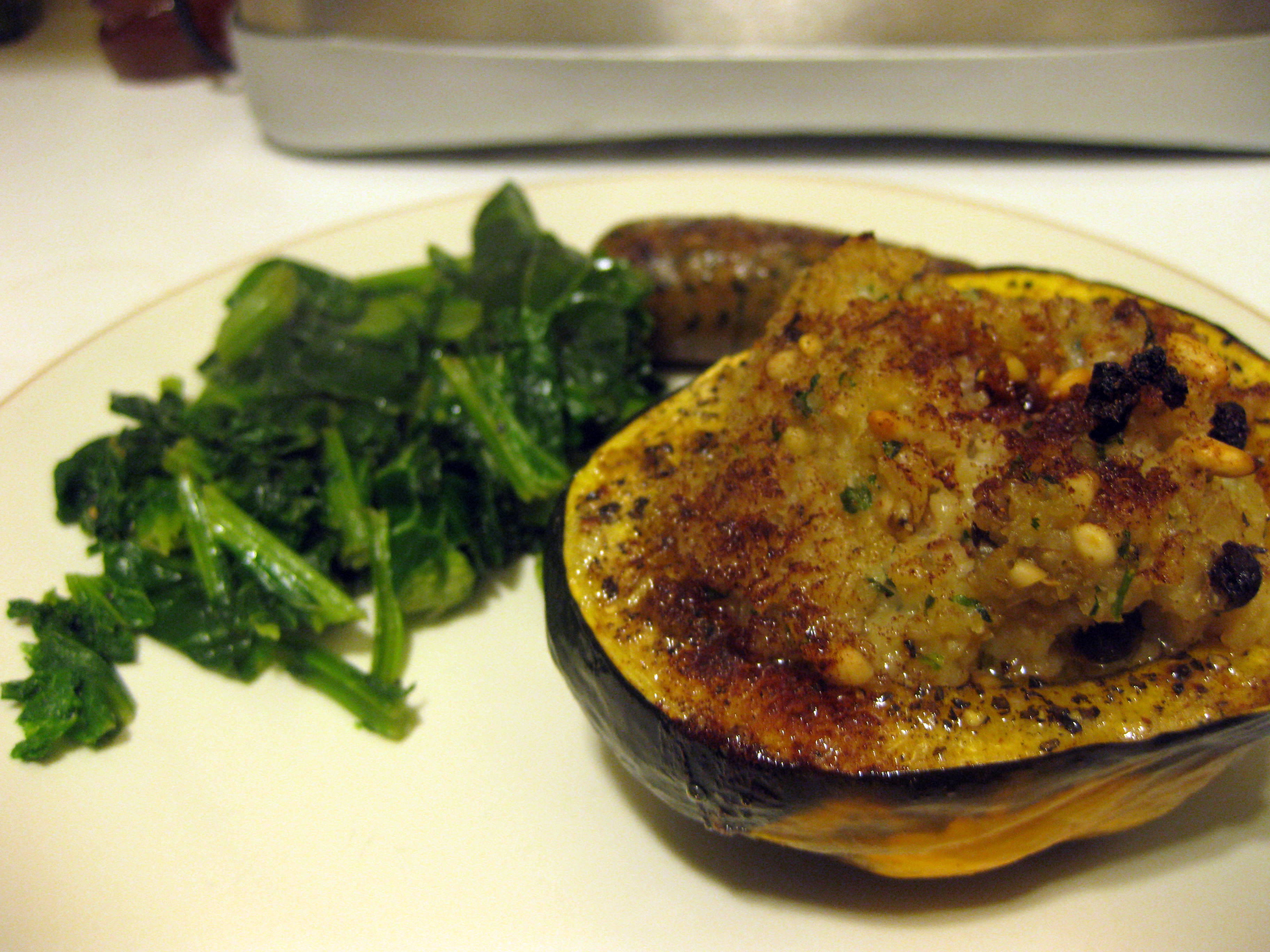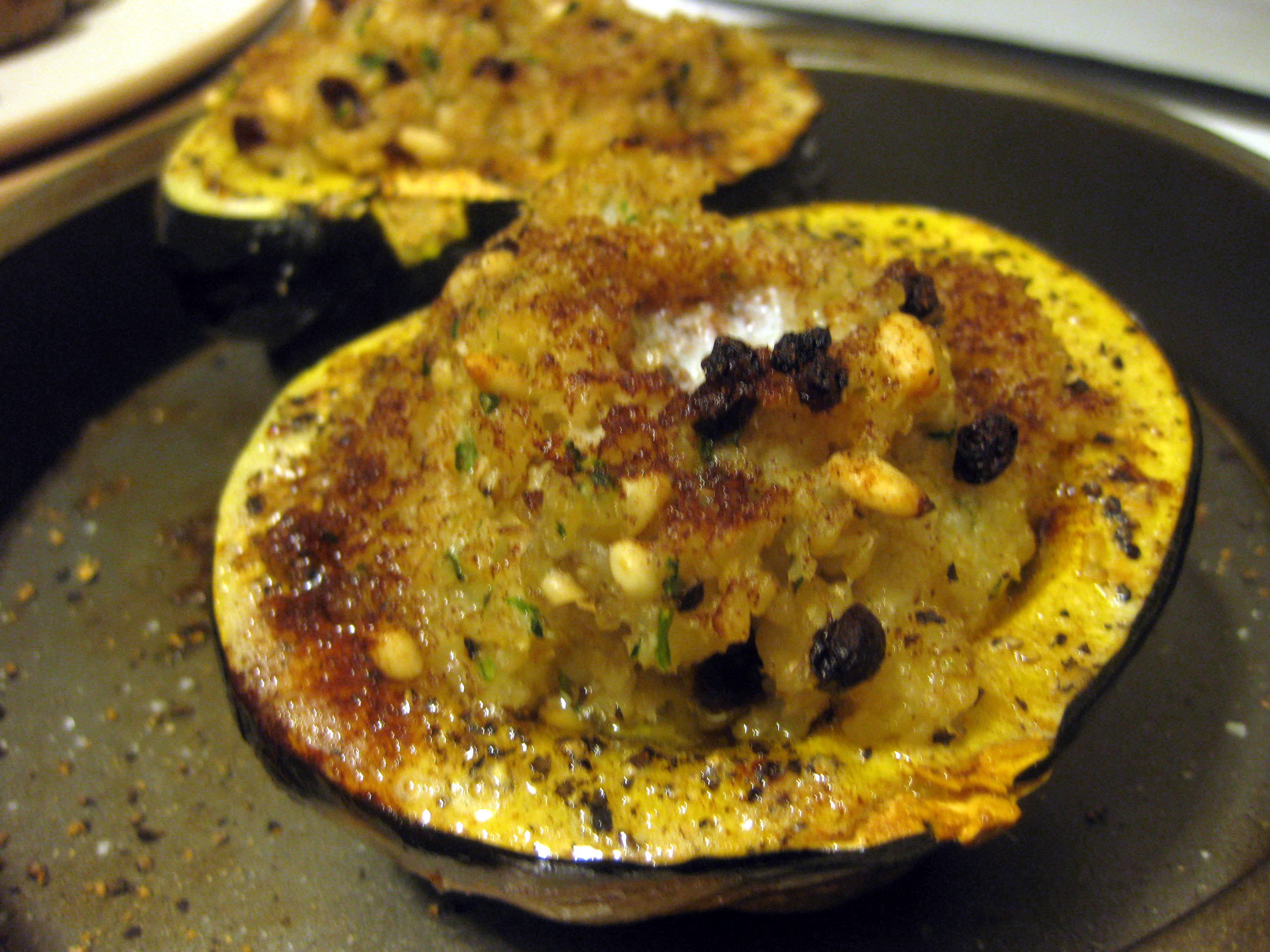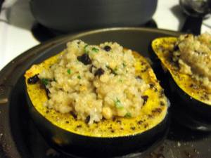 When the bulgur was done, I stirred in the pine nuts, currants, and parsley, which is not on Bittman’s recipe but which I had kicking around in the fridge, begging to add some color to something.  I excavated my squash babies from the oven, basted them up the sides a bit with the now-melted butter in their cavities, then filled up those caves with a few mounded scoops of bulgur stuffing.  I sprinkled the top with cinnamon and then, spurred perhaps by watching too much Paula Deen on the Food Network, halved my last TB of butter and pressed the little cubes gently atop each mound of stuffing.