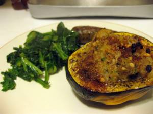 When we dug in, cracking through the crunchy tip of the stuffing pinnacles and scraping the soft orange squash beneath it, I wasn’t sure what to anticipate.  The cinnamon idea was throwing me off.  Even though there was no added sweetener, the cinnamon gave off warm spicy dessert tones, and I think I was expecting that to clash with the squash.  But I had forgotten, somehow, momentarily, that propensity of squash to collect flavors and, chameleon-like, transform itself from a savory item to a potential dessert.  And yet here, while it blended well with the cinnamon and the currants, neither the stuffing nor its vessel read dessert.  They were just warm and comforting, with the surprise spice and crunch on top to add excitement.  The bulgur was still slightly chewy, with that golden nuttiness whole grains so often have, and I considered that if you wanted to make this gluten-free, you could use brown rice or quinoa with fairly similar results.