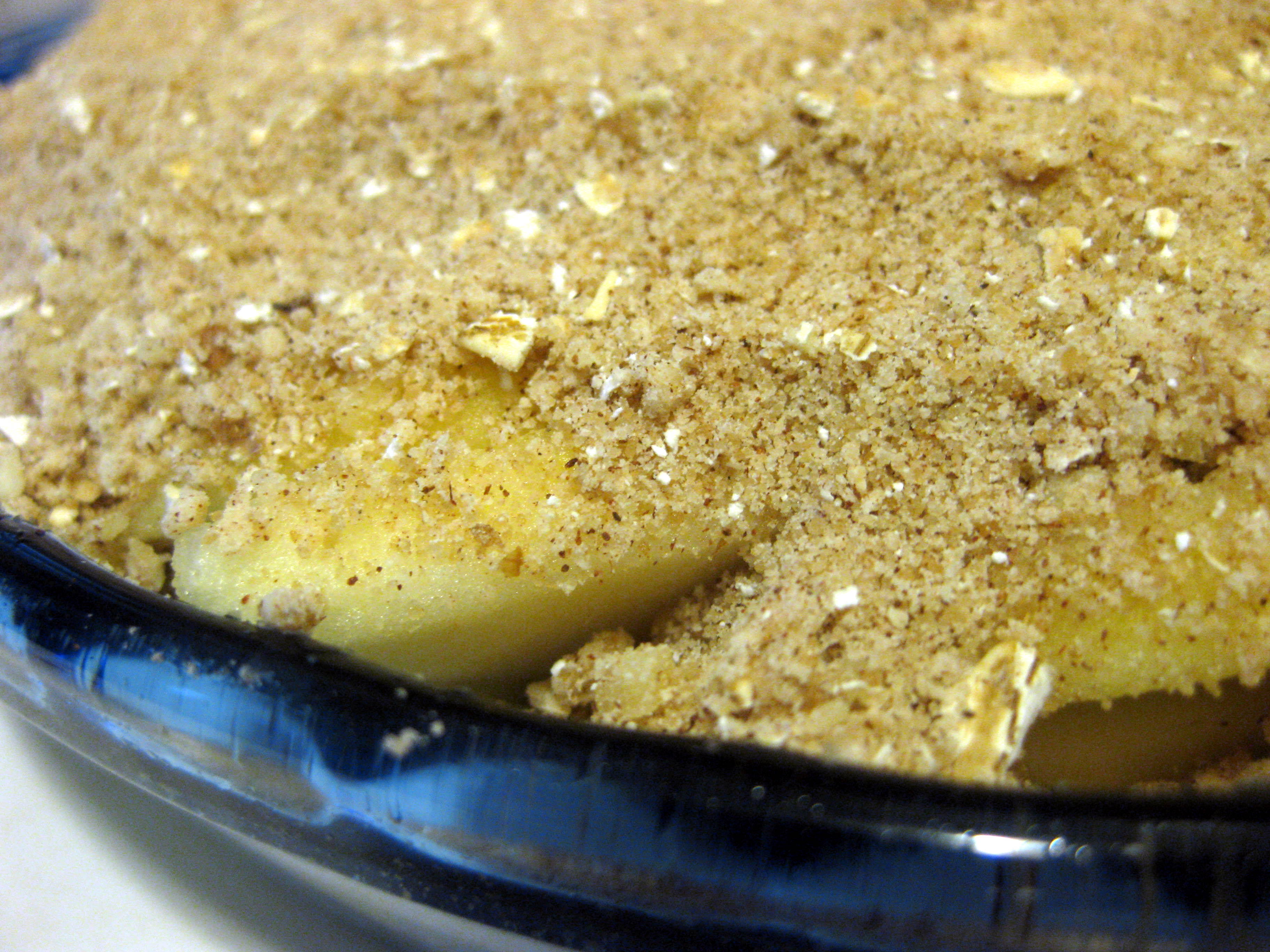 I didn’t have brandy, so I used spiced rum instead. Because the apples were mouth-wateringly tart and the cranberries relentlessly so, I decided to divide the sugar and put about ¼ cup in with the filling, leaving only ½ cup in the topping. This still rendered a very sweet topping, especially on the leftovers ice cold from the fridge. I think I pulsed the topping too much, because what resulted was almost like graham cracker crumbs. I exacerbated the cookie-like texture because, using a pie pan clearly too small for all this goodness, I patted the topping on fairly firmly to keep everything together. I think a 9×9 square baking dish would be the right size for this dessert.