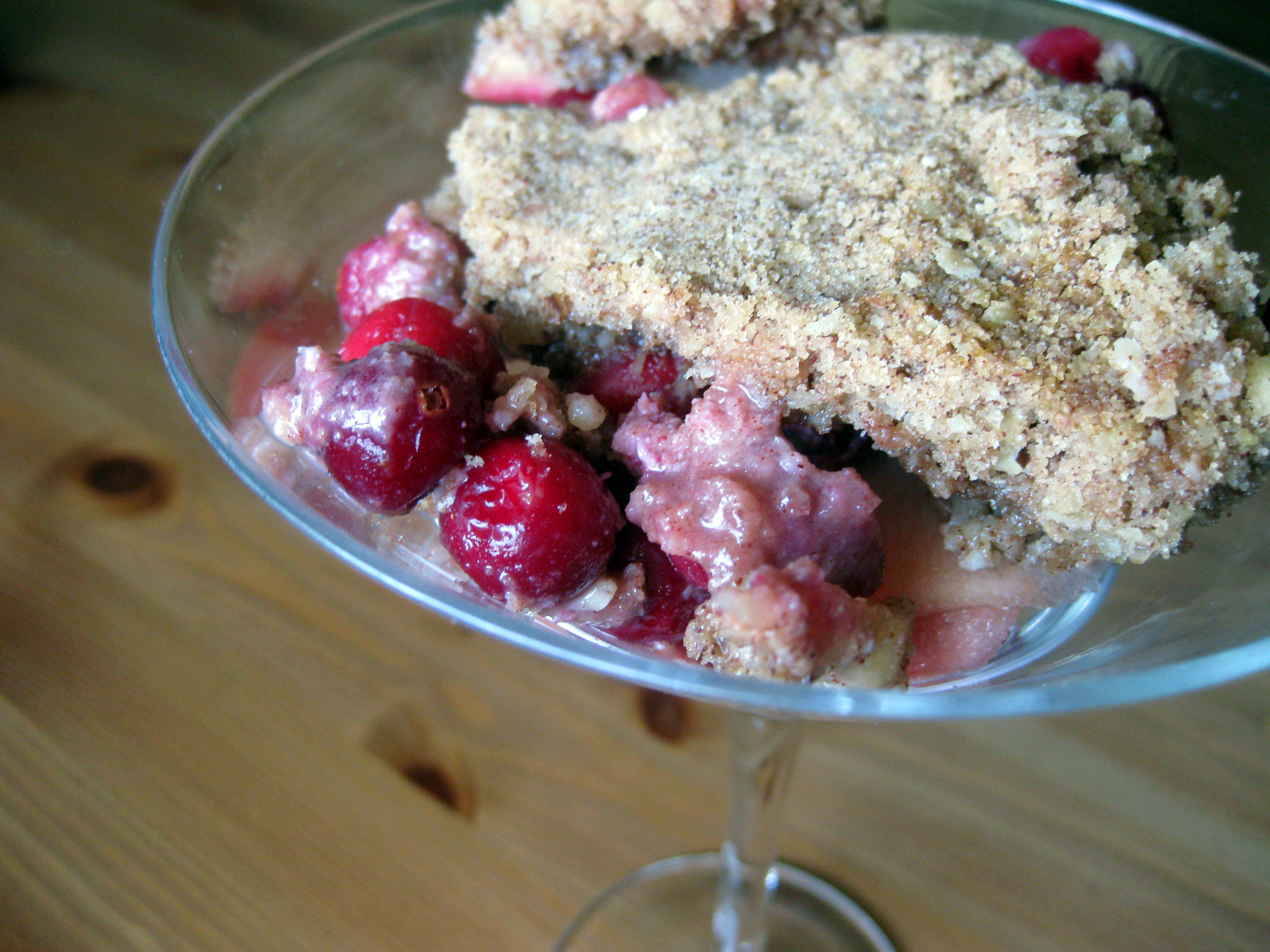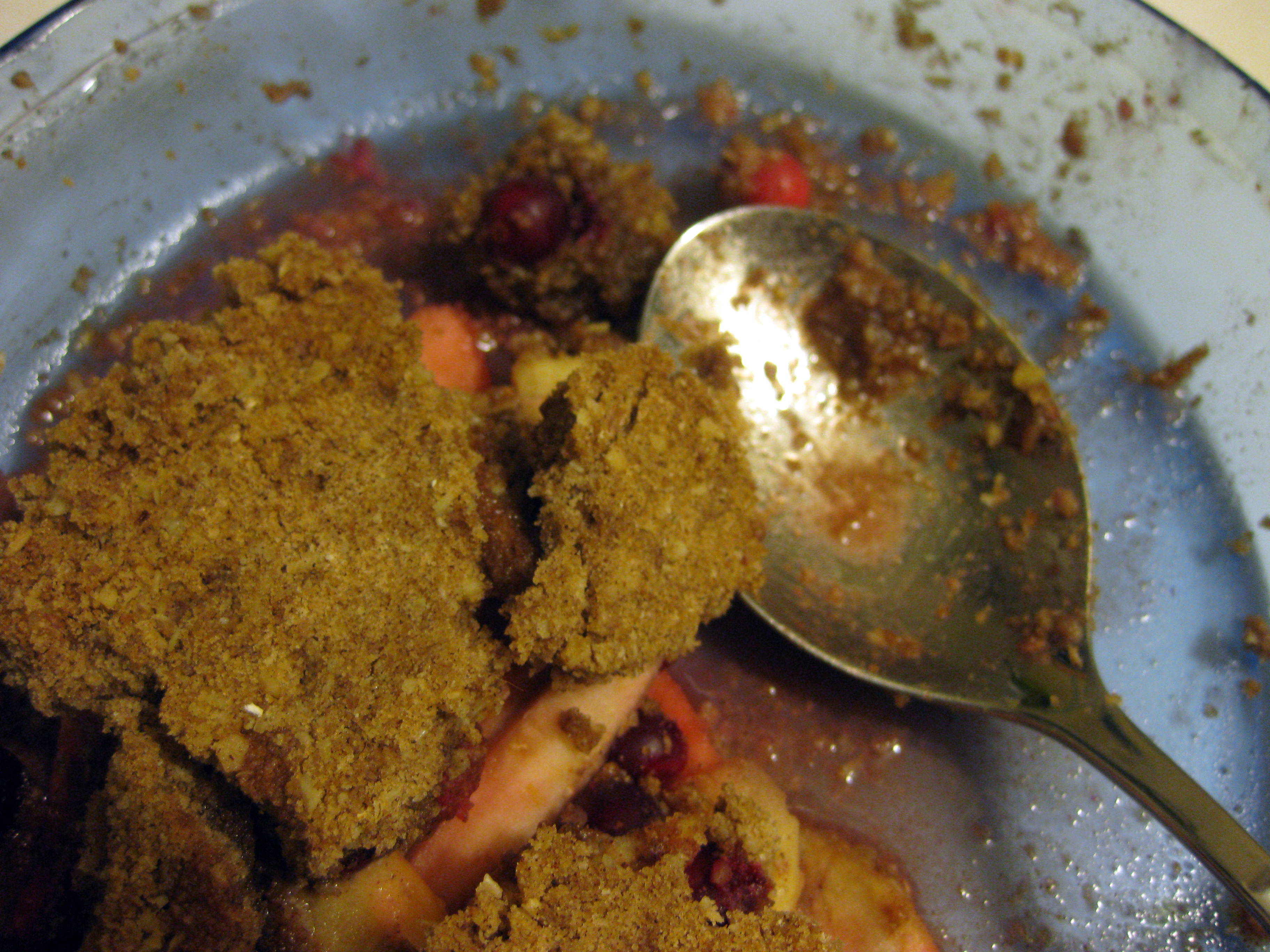 When I served this, spooning tender apple slices stained with juice from the popped cranberries and blanketed with a crunchy, cookie-like layer of awesome, one serving proved not enough. In fact, between me, the two ladies I was sharing with, and N. when he sneaked through to pick up dessert near the end of the show, we devoured about ¾ of this simple, homey treat in one evening. And we didn’t even have ice cream on the side.