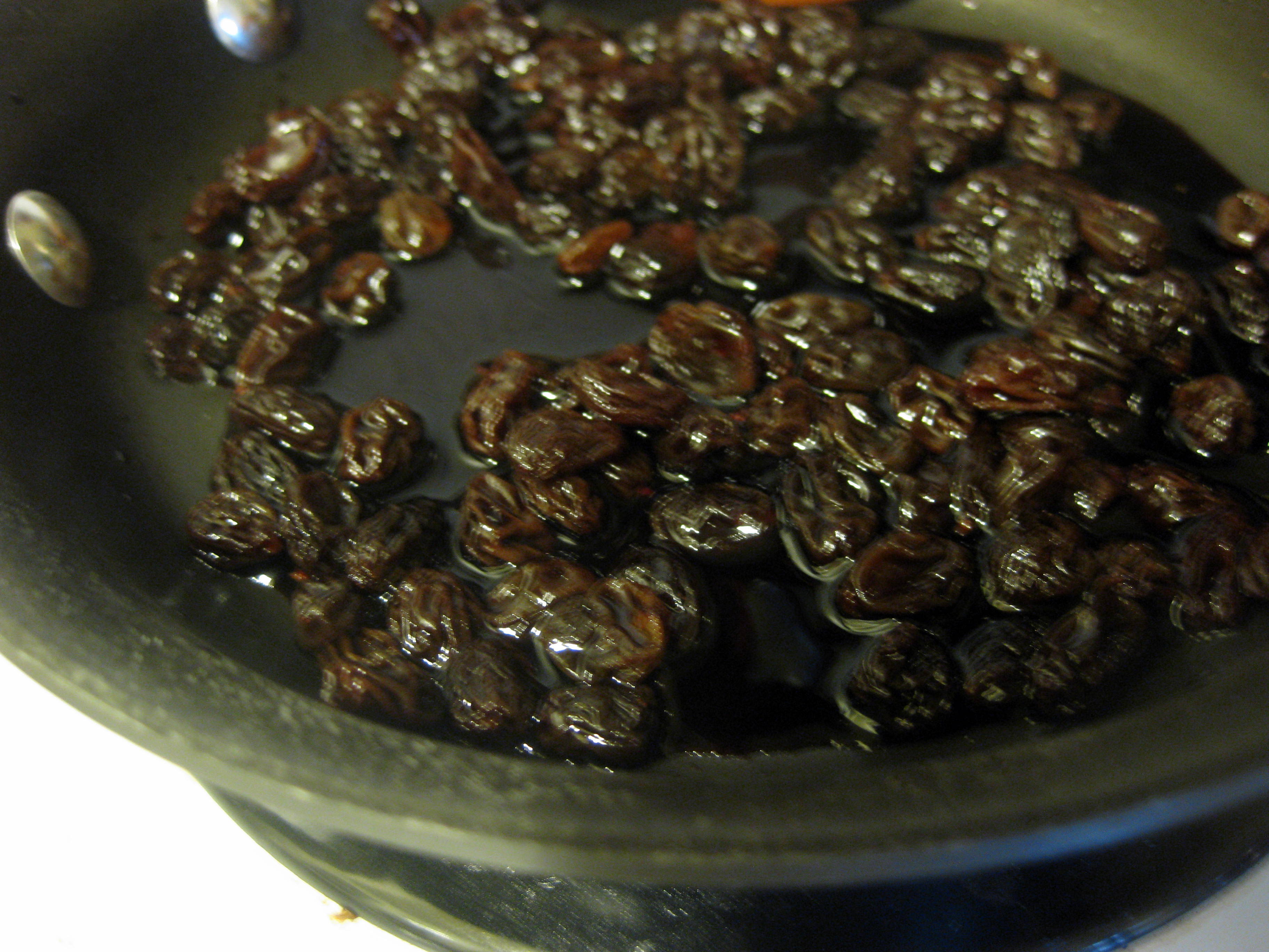 As I prepared to sweat the onions in my biggest saucepan, I was struck with genius.  Why not add the raisins to the “port” sauce?  I dumped them in and continued to let the liquid just barely simmer, while the raisins plumped up and took on new, more exciting flavors from the vinegar and wine.  Once genius had been attended to, and my other skillet was shimmering with its shallow pool of olive oil, I added the onions and cooked them gently for five or ten minutes until they were soft but not browned.
