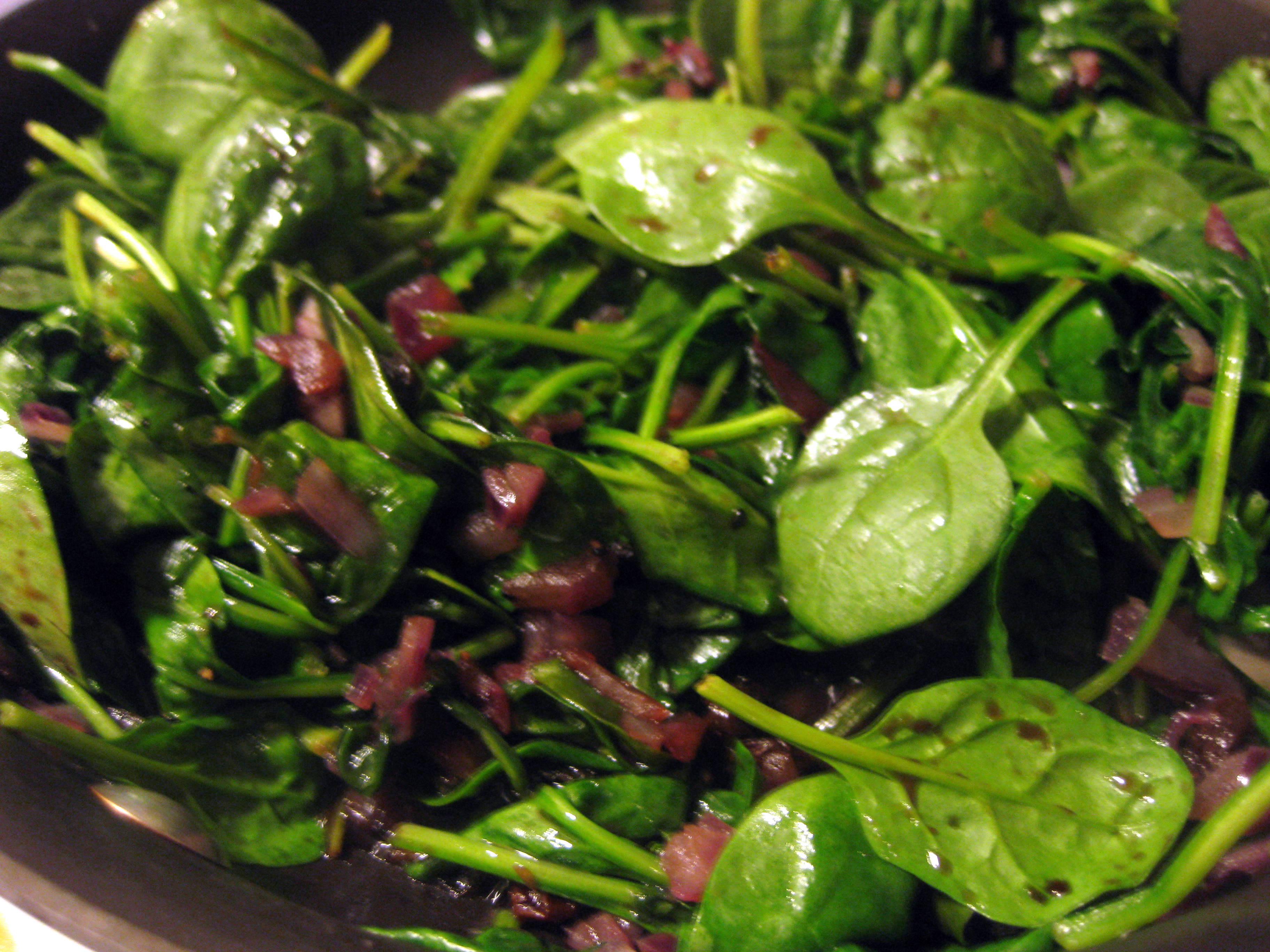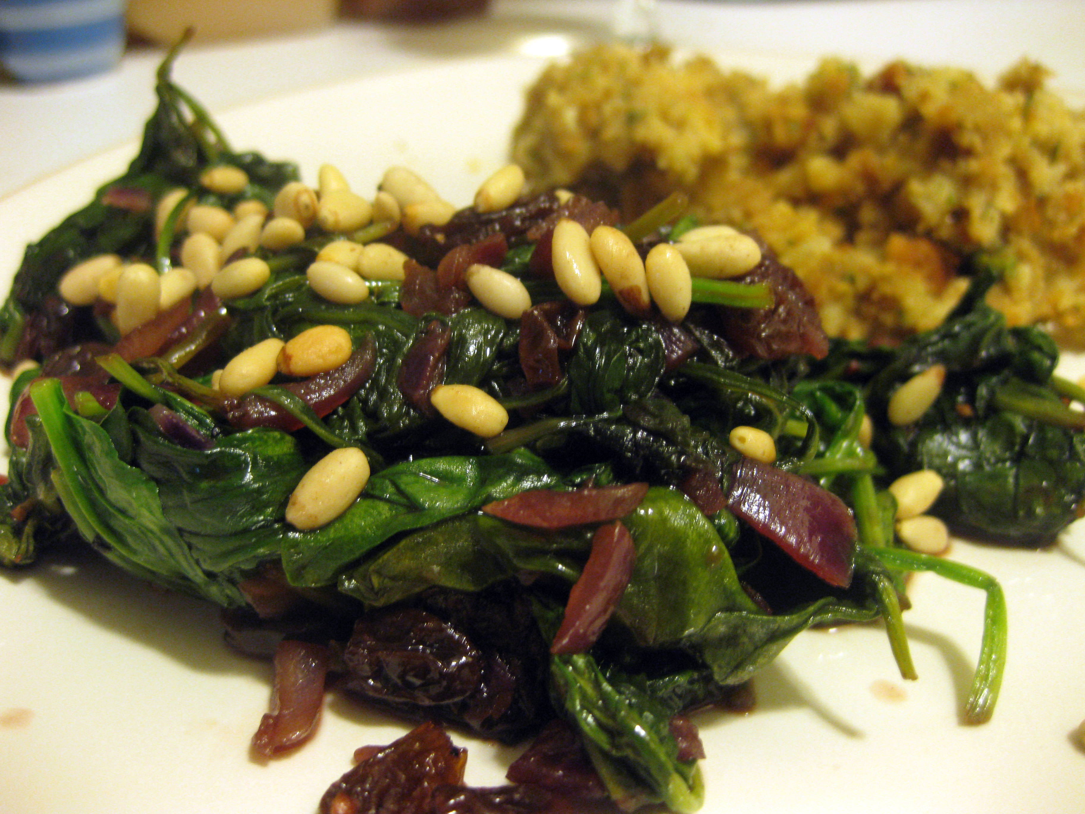 “50.  Cook chopped onions in olive oil until soft.  Add chopped spinach and a handful of raisins – maybe a little port, too – and cook until wilted and almost dry.  Roasted pine nuts are good on top.”