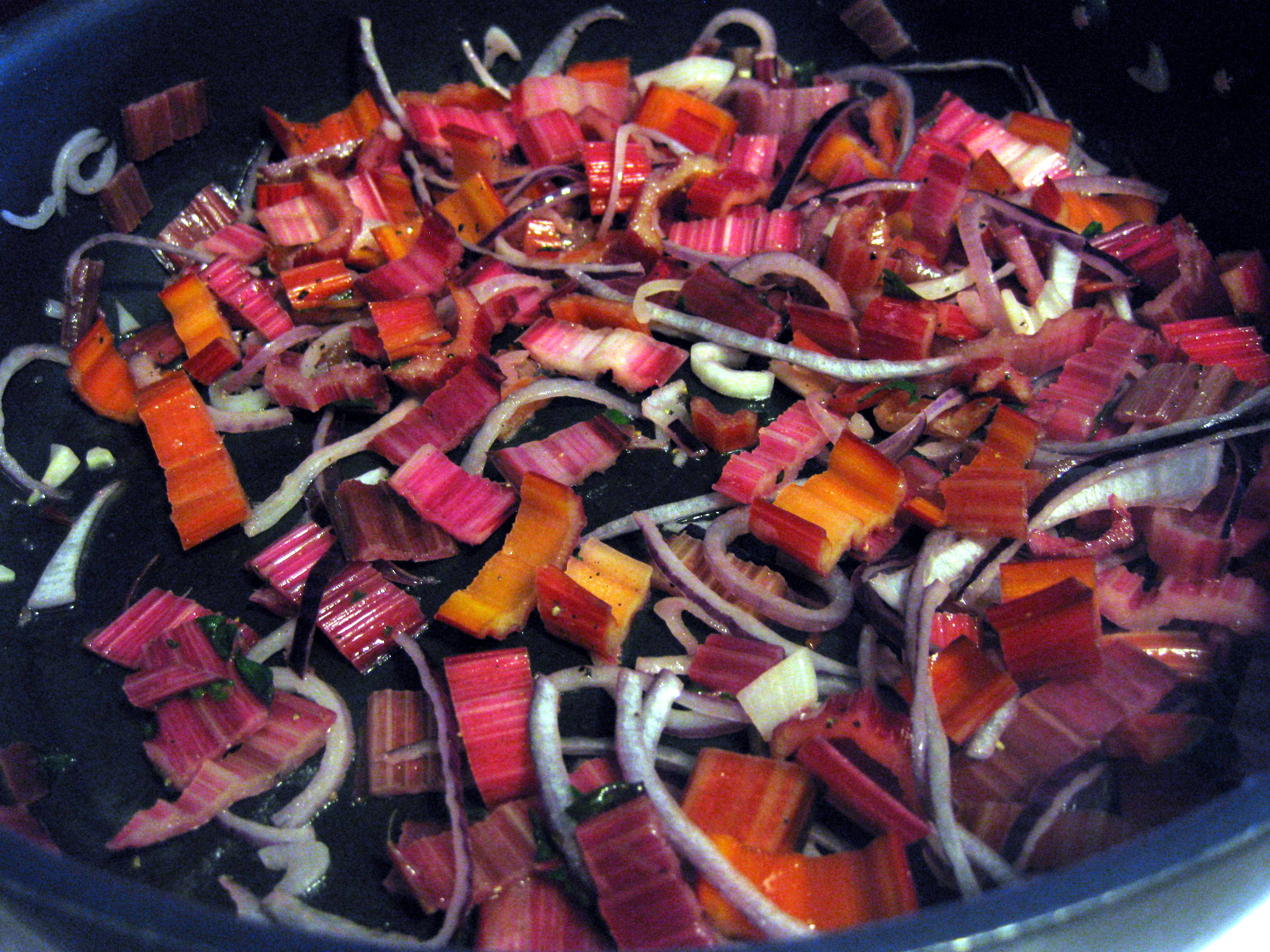 While the couscous baked, I prepped our vegetable side. With the Farmers’ Market back up and running, the profusion of leafy vegetables is almost overwhelming. Without intended anything of the kind, I had brought home an enormous bundle of rainbow chard – red, pink, orange, salmon colored stems – and decided to impart some vinegar-based freshness into it as well. I sliced the leaves away from the thick stems and then chopped the stems like celery into half-inch-or-so thick pieces. Then I dropped stems and wafer thin slices of ½ a red onion into a pan with a few tablespoons of butter. While those cooked down, I chopped the chard leaves roughly and considered flavorings. Though I often pair chard with nutmeg, craisins, or balsamic vinegar, this didn’t seem like the right companions for tonight. Sometimes I add garlic, sesame oil, and soy sauce but this, too, seemed like it wouldn’t mesh well with our zesty-fresh couscous. At last, genius! I dribbled in not only a few teaspoons of cider vinegar to match the flavor in the couscous, but at least a tablespoon of whole grain mustard, which I scrambled quickly amidst the softening stems. Then all that remained was to toss in the leaves, turn them over in the pan a few times until they wilted, and add some salt and pepper. Bingo. Amazing.