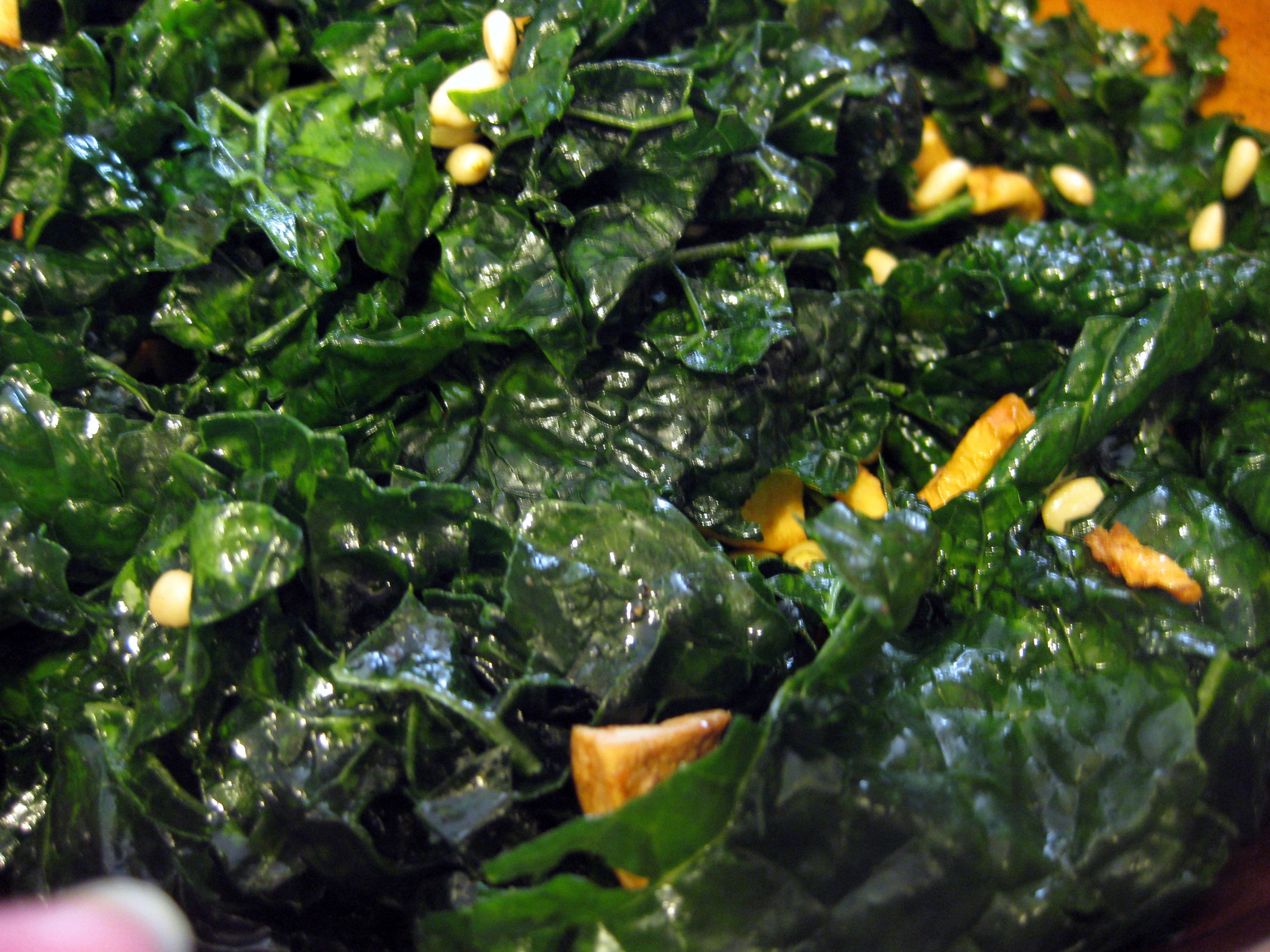 I tossed the kale with olive oil and lemon juice in a large salad bowl, then added the pine nuts and apples. A quick taste led me to add a miniscule sprinkle of salt, and then it was ready to serve!