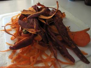 Orange is a hot color. It’s flame and earthy warmth and friendly heat. But it’s also freshness and citrus-bright and spicy. It’s a fall color and a summer color. This is convenient, considering Oregon’s spastic and reluctant attempts to approach spring/summer. Interestingly too, the particular orange combination Bittman offered us this past week was a salad made from winter root vegetables, with a peppery summery acidic dressing. Juxtaposition of seasons. Juxtaposition of flavors.