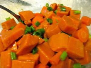 “68. Peel sweet potatoes and boil until tender, drain and cool; dice. Treat carrots the same way. Make sauce of Dijon mustard, olive oil, cider vinegar and chopped scallions. Toss all together.”