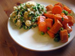 Now, instead of a steaming vegetable dish and a cold pasta salad, we had hot, vegetable-laced pasta and a cold vegetable salad. It was a delicious juxtaposition, with the wintry roots flavored in bright, commanding acidity and the couscous dressed with springiness. I loved what the mustard and vinegar did for the carrots and the sweet potatoes, playing against their inherent sweetness to add complexity and interest. Cleaning up after dinner, N. and I couldn’t stop grabbing chunks of their sour-sweet tastiness with our fingers out of the bowl. I will certainly make this one again.