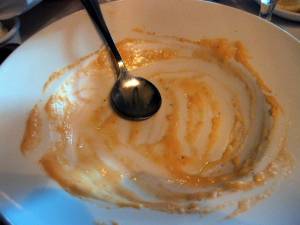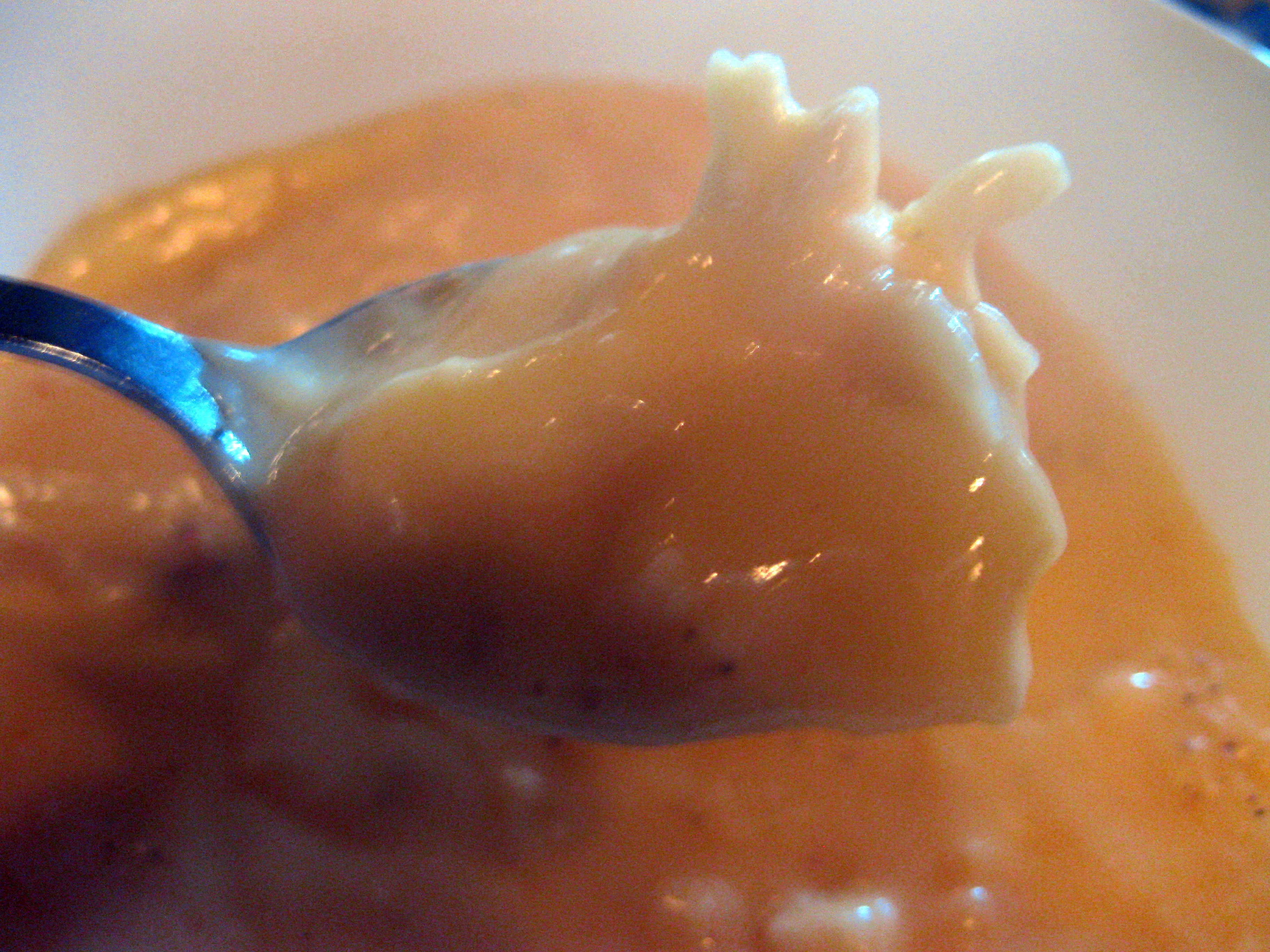 Lobster bisque, supremely creamy and rich, studded throughout with half-dollar sized lumps of lobster