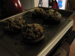 I lumped, and piled, and stacked the filling into the mushroom caps, which I’d positioned on a baking sheet.  Then I plunged the whole thing into the oven, which was preheated to a temperature that, embarrassingly, escapes me.  It was one of three temps: 350, 375, or 400F.  Though a higher temperature will of course produce a crunchier, browner top, I don’t think this variance of 50 degrees will make an amazing amount of difference to your results.