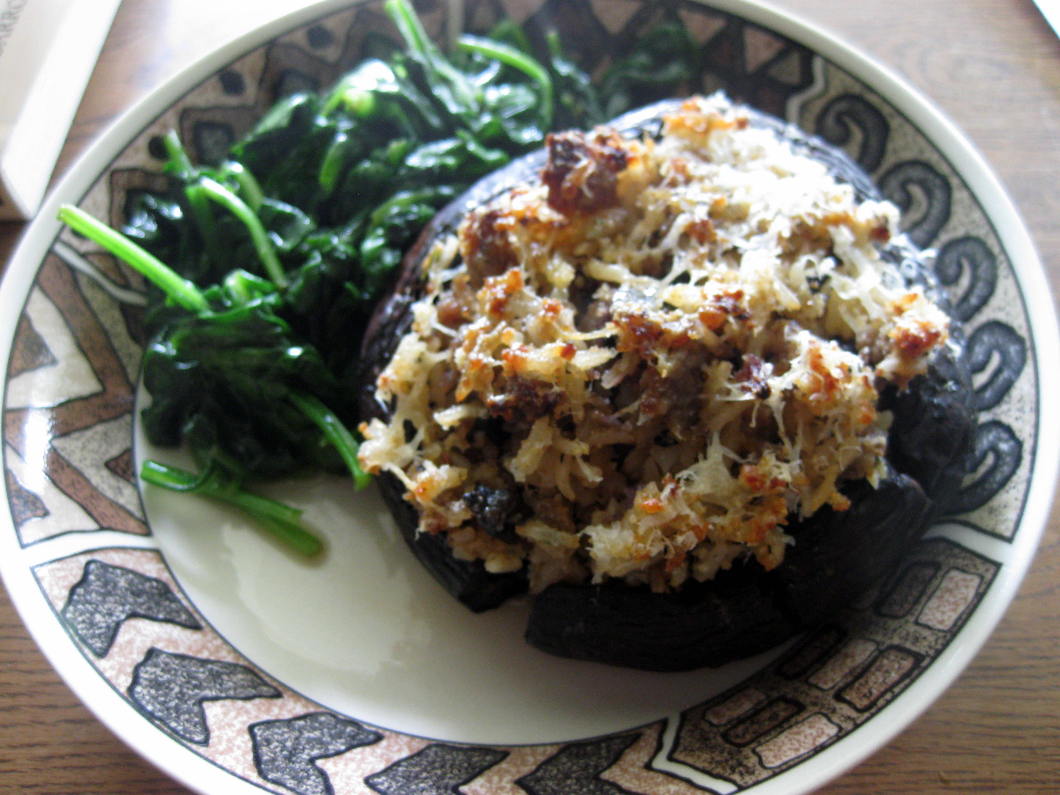 “39. Trim crimini or Portobello mushrooms and chop stems.  Cook crumbled sausage in olive oil until it begins to brown, then add stems and chopped onion and garlic.  Mix with cooked rice, an egg for every 2 cups of mushrooms and enough bread crumbs and Parmesan to bind slightly.  Spoon the stuffing into the mushroom caps and bake until tender.”