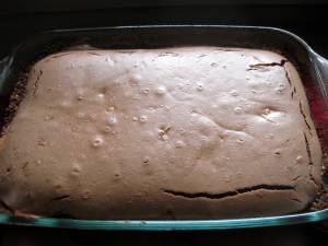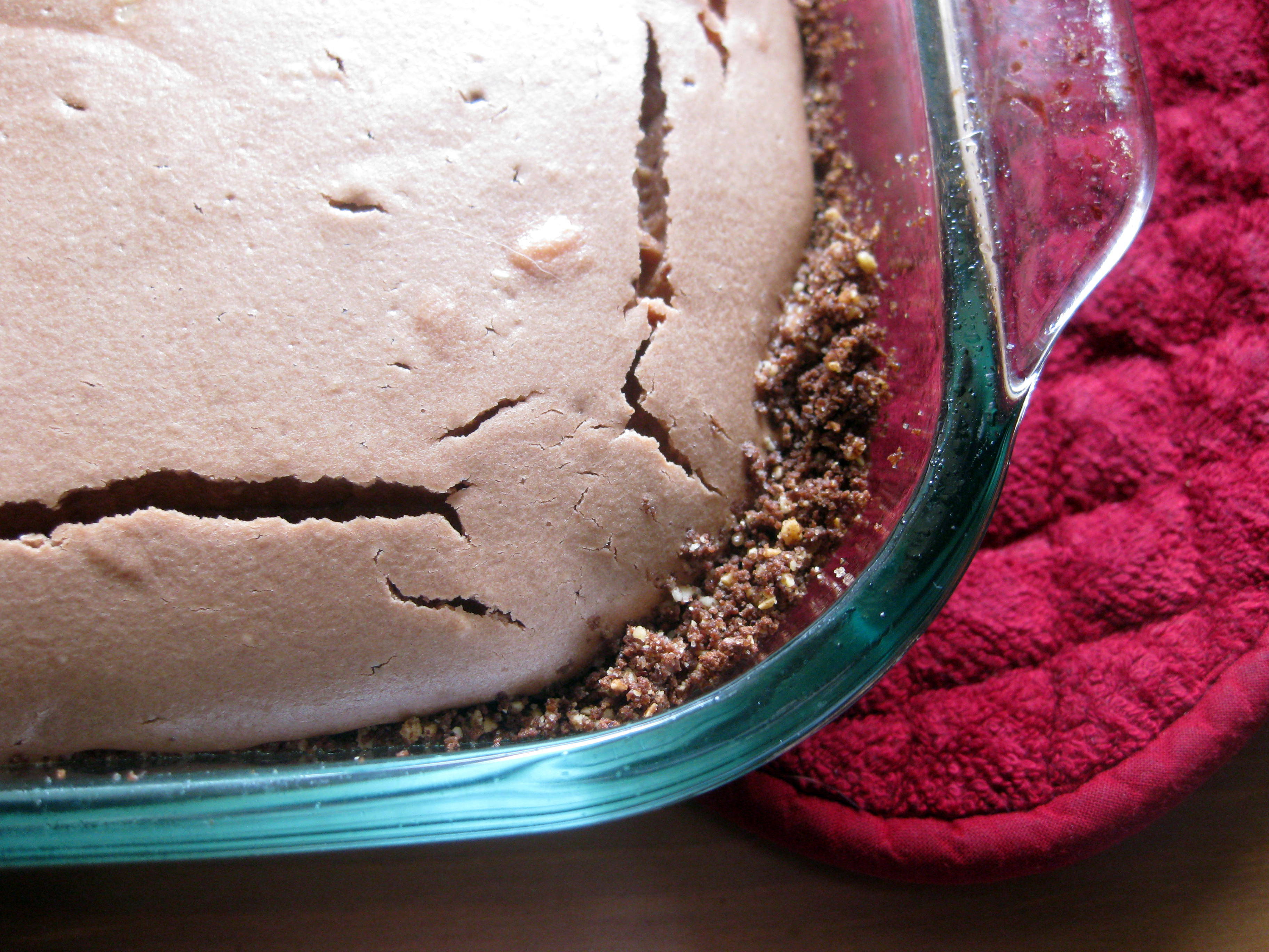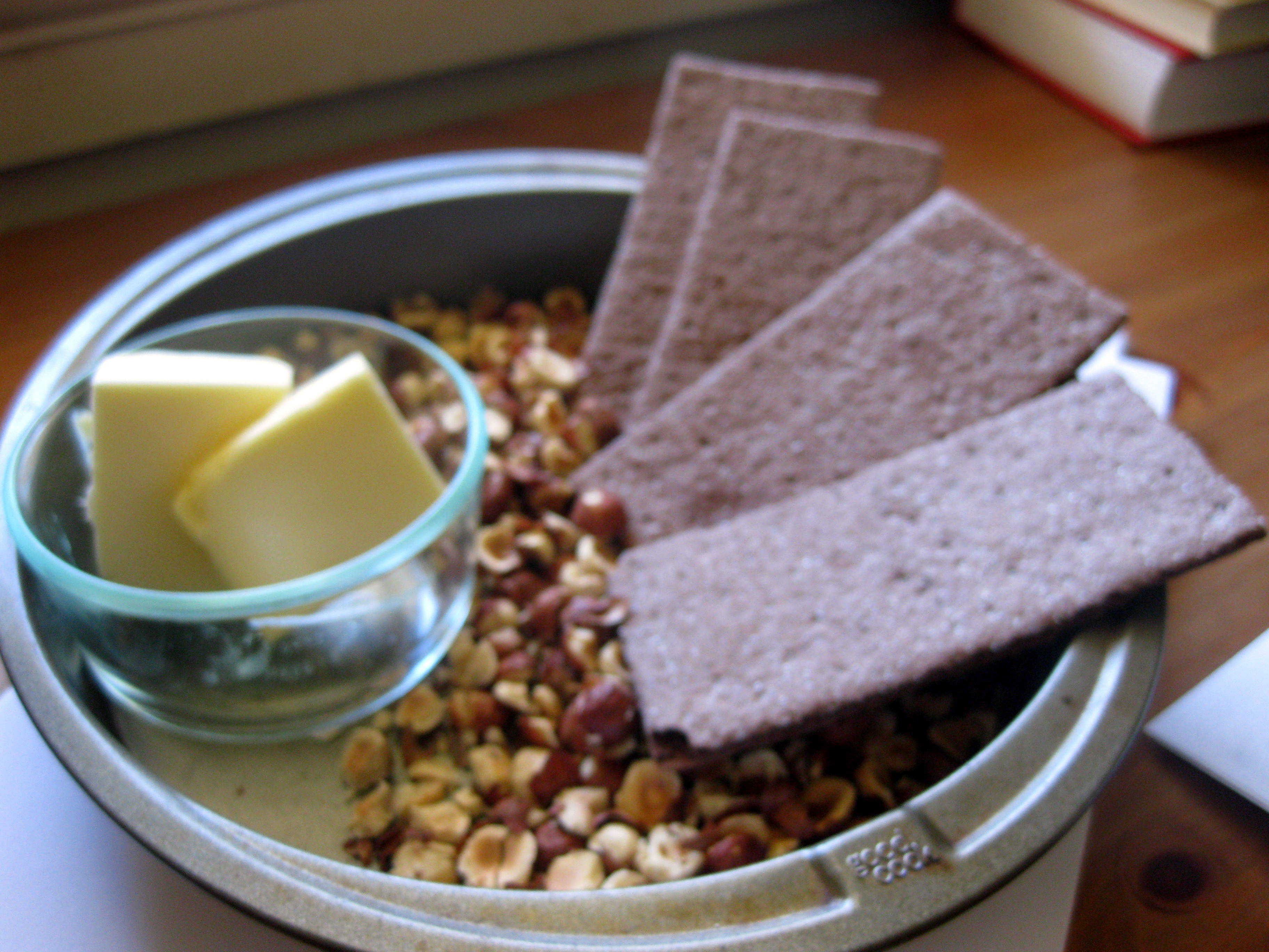 In a food processor, pulverize the hazelnuts until very fine – almost a meal. Add graham crackers, salt, and sugar and grind until everything is homogenous and very fine. With food processor running, dribble in melted butter and pulse until crumbs are moistened and clumping together. Dump out into the baking vessel of your choice (I don’t have a springform pan, so I used a 9X13” glass baking dish. I don’t know how these amounts would correspond to a springform pan). Using your fingers or the curved bottom of a measuring cup, tamp down the crumbs into a crust of uniform thickness over the bottom and partway up the sides of the vessel you have chosen.