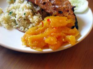 This was a really nice chutney because it addressed almost every type of taste.  There was copious sweetness from the apricots, there was heat from the chilis, there was a different kind of heat from the ginger, and the cloves and lemon juice added tinges of bitterness and sourness.  It was the variety of heats that I really appreciated, though, because it made every bite really interesting: the ginger was there right from the start, encasing the tip of the tongue with heat.  The peppers kicked in as we chewed, with a fresh bright hotness like a fiery salsa, but just for a moment.  Then the cloves added earthy warmth at the back of the throat while the kick from the ginger still lingered on the tongue.  Combined with the well-spiced sauce on the chicken, it was delightful eating.