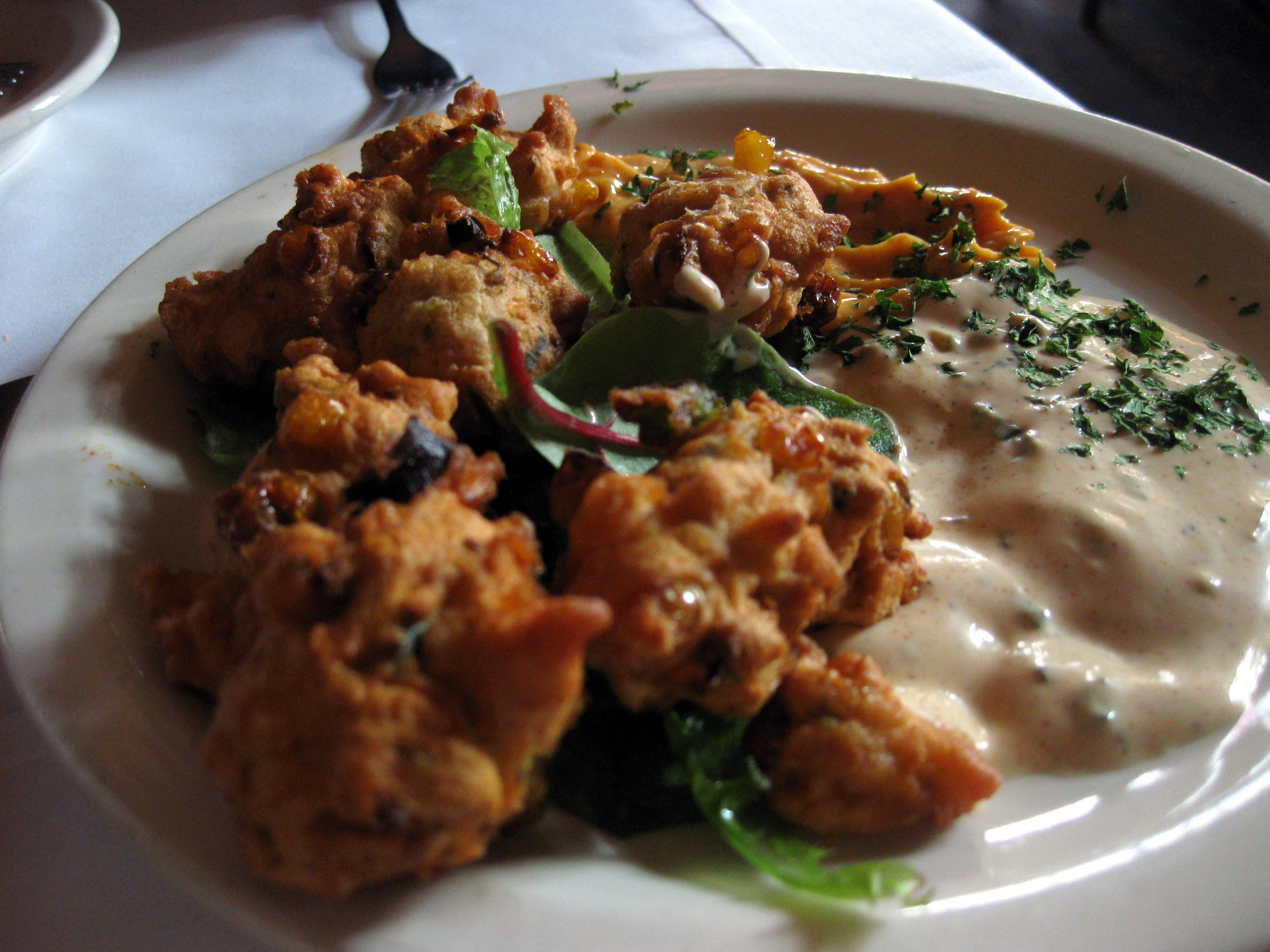 Before any of that, however, we got our beverages and shared a plate of hush puppies. My dry Riesling was crisp and tart and just barely fruity, and our server really topped off my glass because there wasn’t enough left in the bottle for two. I told him it was my birthday, so he could use that as an excuse and he chuckled. Wine managed, we plowed into the hush puppies. These were moist and chewy and had kernels of corn in the batter for that pop of sweetness and texture. They were accompanied by two aiolis: one garlic and one red pepper (I think. It was extremely mild and our server wasn’t sure). The garlic aioli was delicious: slightly vinegary and herby, much more complex than a regular mayonnaise. The fritters were not very crunchy on the outside, but their flavor more than made up for any textural shortcoming.