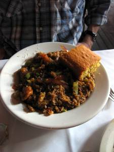 Dinner arrived on white dishes, but it didn’t smell highbrow. It smelled homey and warm and wonderful. N.’s jambalaya was well spiced and nicely flavored. It was just spicy enough to merit a gulp of beer and a crumble of cornbread in between bites, and he has added this to the list of dishes he’d like me to try at home. My plate came with its promised hindquarters still connected, dredged and crispy and beautifully caramel-brown. A little heap of mixed sauteed vegetables nestled in the space between leg and thigh, and a mound of mashed potatoes rounded out the plate.