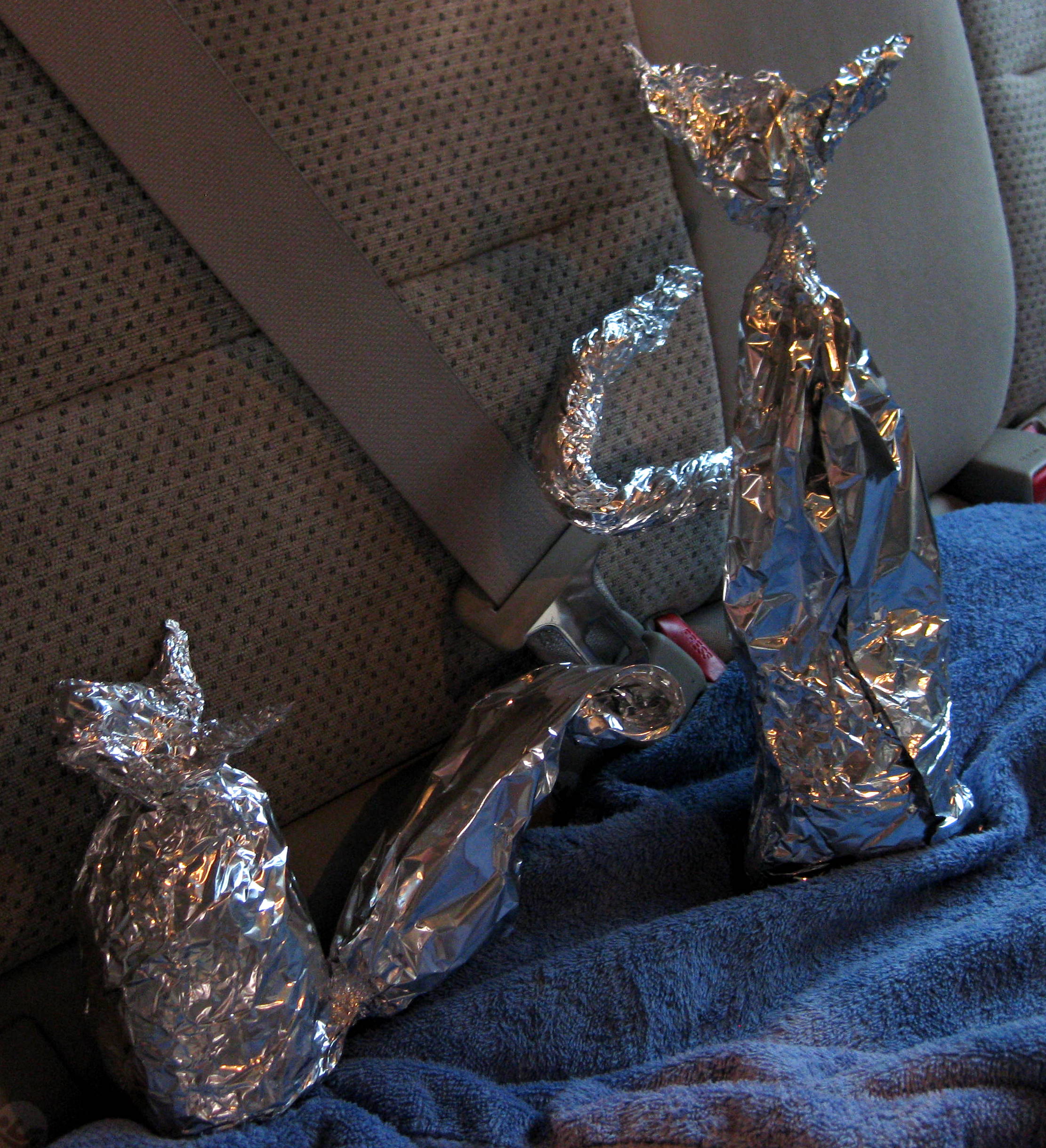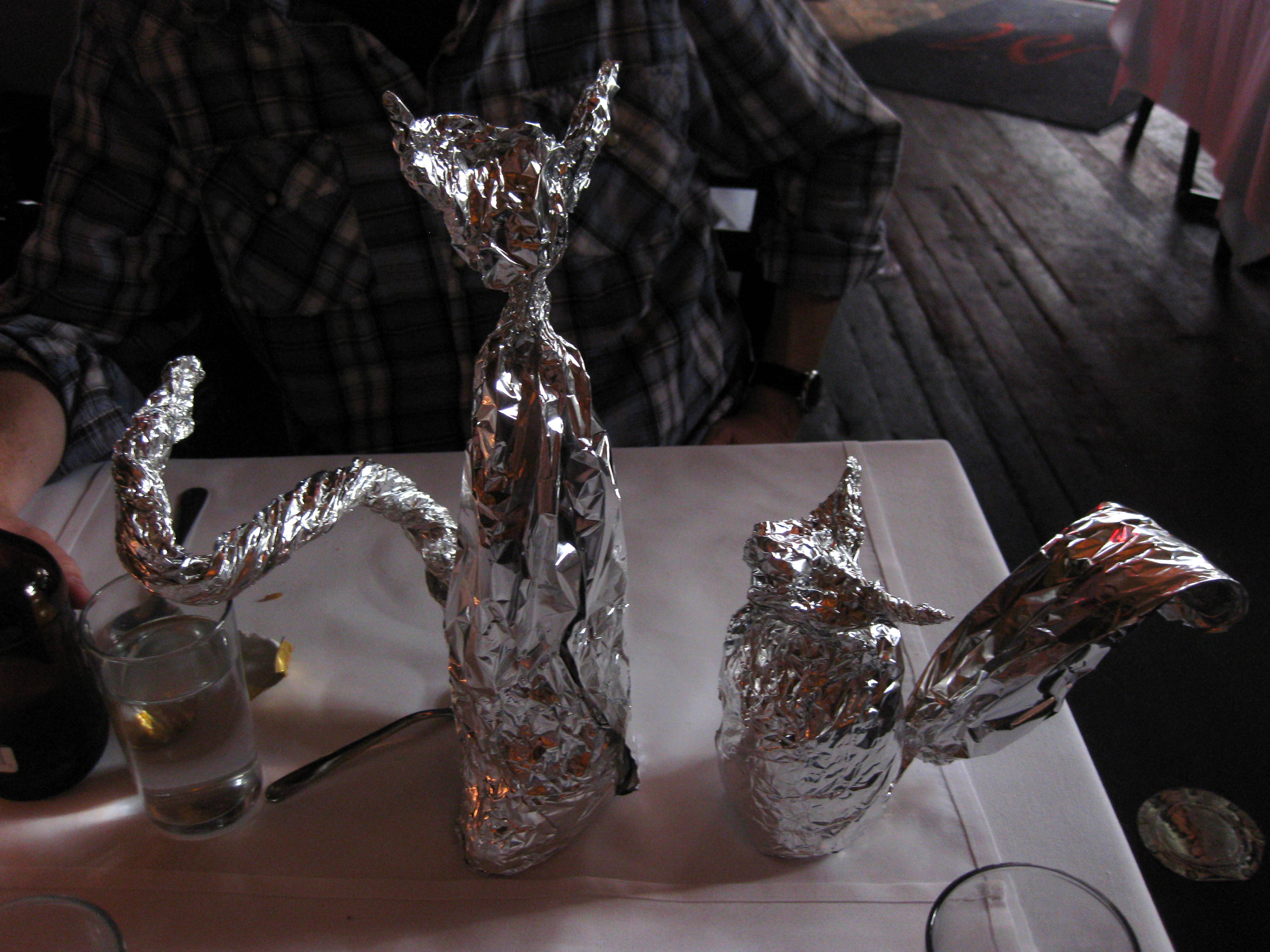 The play of culture and carnivale continued as we finished our meal. Our server asked if we wanted our leftovers wrapped up, and when we acquiesced he disappeared with our plates and returned with a stylized cat and squirrel made of aluminum foil, holding our remaining dinners in their tin bellies. As they faced off against one another at the table, our server walked over holding a plate leaping with orange and blue flames: dessert on fire for my birthday. Unless N. ordered this while I was in the ladies’ room (I suspect not), this was our server’s doing alone. I’d mentioned it was my day at the outset of the meal, but I hadn’t been expecting anything from it. Instead, what I got was essentially ice cream pie set alight.