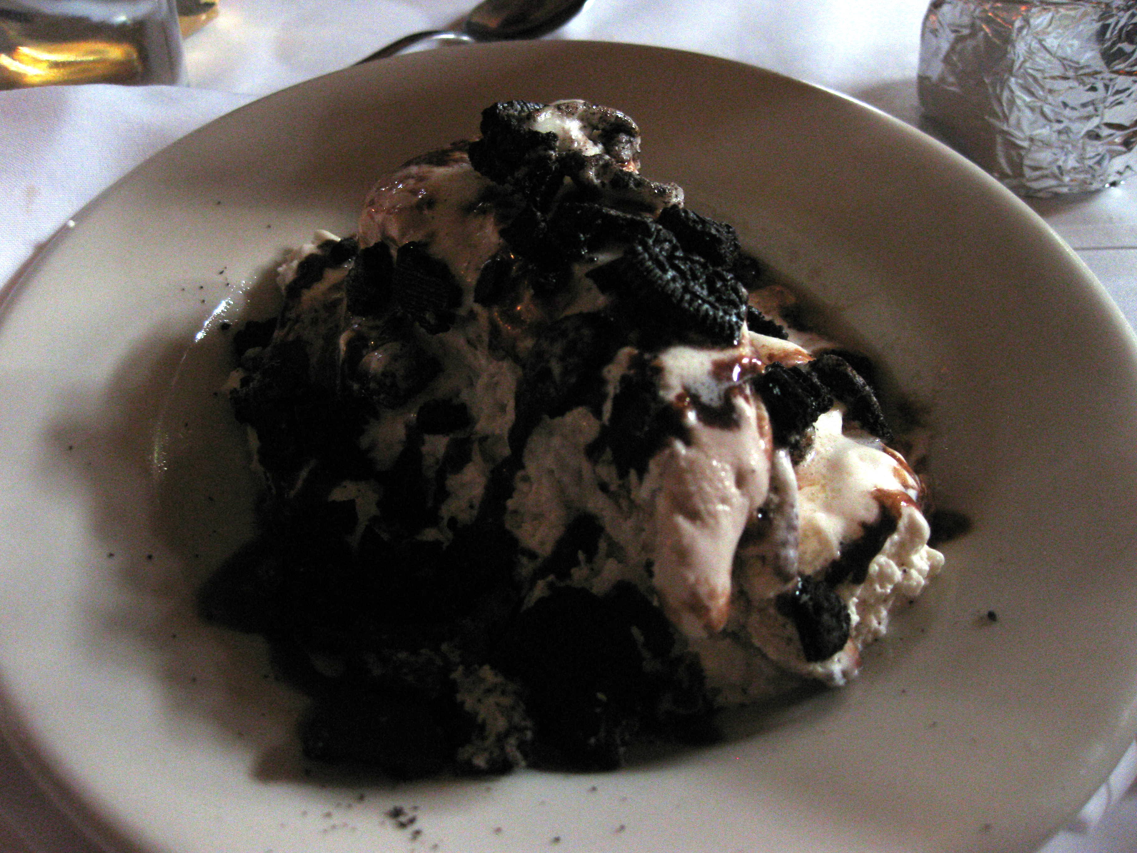 How do I begin to dissect this gorgeousness in words? Writing about food is funny because so often language fails to capture taste. I’ll go in the order my spoon went. First, there was the ice cream. This was either vanilla or very mild coffee, because we were getting hints of coffee flavor the whole way through. I suspect, however, that it was vanilla ice cream, and that the spirit used to flame the dessert was Sambuca, and that’s where the coffee flavor came from. Or else the ice cream was also drizzled with Kahlua. Beside the slice of ice cream, there was an airy pile of whipped cream, also drizzled with chocolate/coffee sensations, and the whole dessert was topped with crushed chocolate Oreo wafers, and built upon a slab of compressed bittersweet chocolate crust. Frozen but on fire, soft and creamy with crunchy accents, sweet but with an espresso bitterness, this captured the juxtaposition of the whole place on a single white plate. N. is not often one for rich desserts, but this one he ate as continuously and determinedly as I did. He laid his spoon down only two bites before I did, leaving the last swirls of melting ice cream and heavy liqueur traces to me alone. It was, after all, my birthday.
