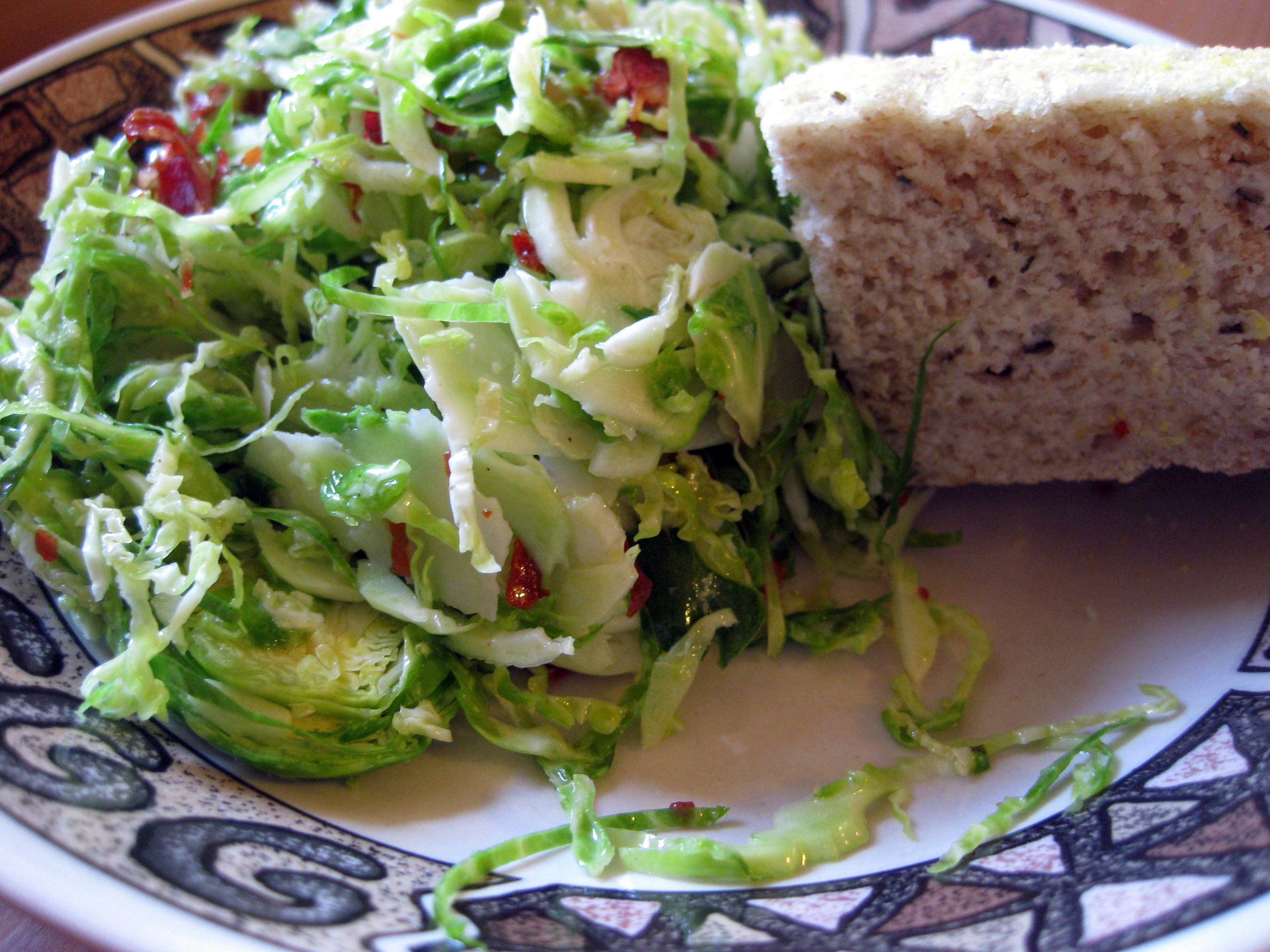 72. Trim and shred raw brussels sprouts (the slicer on a food processor works well). Toss with lemon vinaigrette and shaved or grated Parmesan. Crumbled bacon, as usual, is a welcome visitor here.