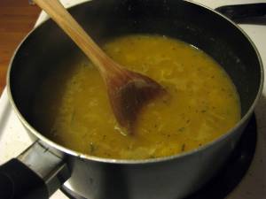 When the squash was cool, I scraped all the flesh out of the shells and dumped the flesh into the pot with my caramelized shallot. I added my turkey stock just to cover the squash, the rosemary, a little salt and pepper, and brought it to a slow simmer.
