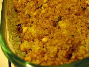 When the couscous is done, fluff it with a fork, toss in remaining ingredients, and stir together. Transfer to your oiled baking dish and bake for 25-30 minutes, or until the top is just crunchy and golden.