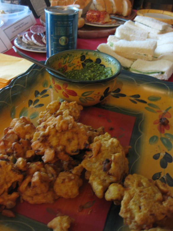 I found a recipe for a coriander chutney replete with tart lemon juice, lip puckering spice from serrano chiles, and bright, bright green cilantro, tempered by shredded coconut. The recipe called for unsweetened coconut but I, in my haste, having only sweetened, forgot to rinse it to get some of the sugar off before dropping it into my food processor. As a result, my chutney was lightly sweetened, but no one seemed to mind that, especially when it was spread onto the pakoras I made.