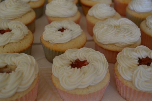My mom dipped apricots in a boiling bath so she could slip them easily out of their skins, and she chopped them up in a medium dice to add to the mush of raspberries we had available, water, a small drift of sugar, and a generous splash of dry white wine. We cooked this down for at least half an hour, then poured off some of the remaining liquid and cooked it a bit more. What was left was the consistency of loose jam, and pleasantly melon-colored. To be honest, though the combination was nice and the filling tasted fine with the cupcakes, I think it could have benefited from less cooking time and less sugar.