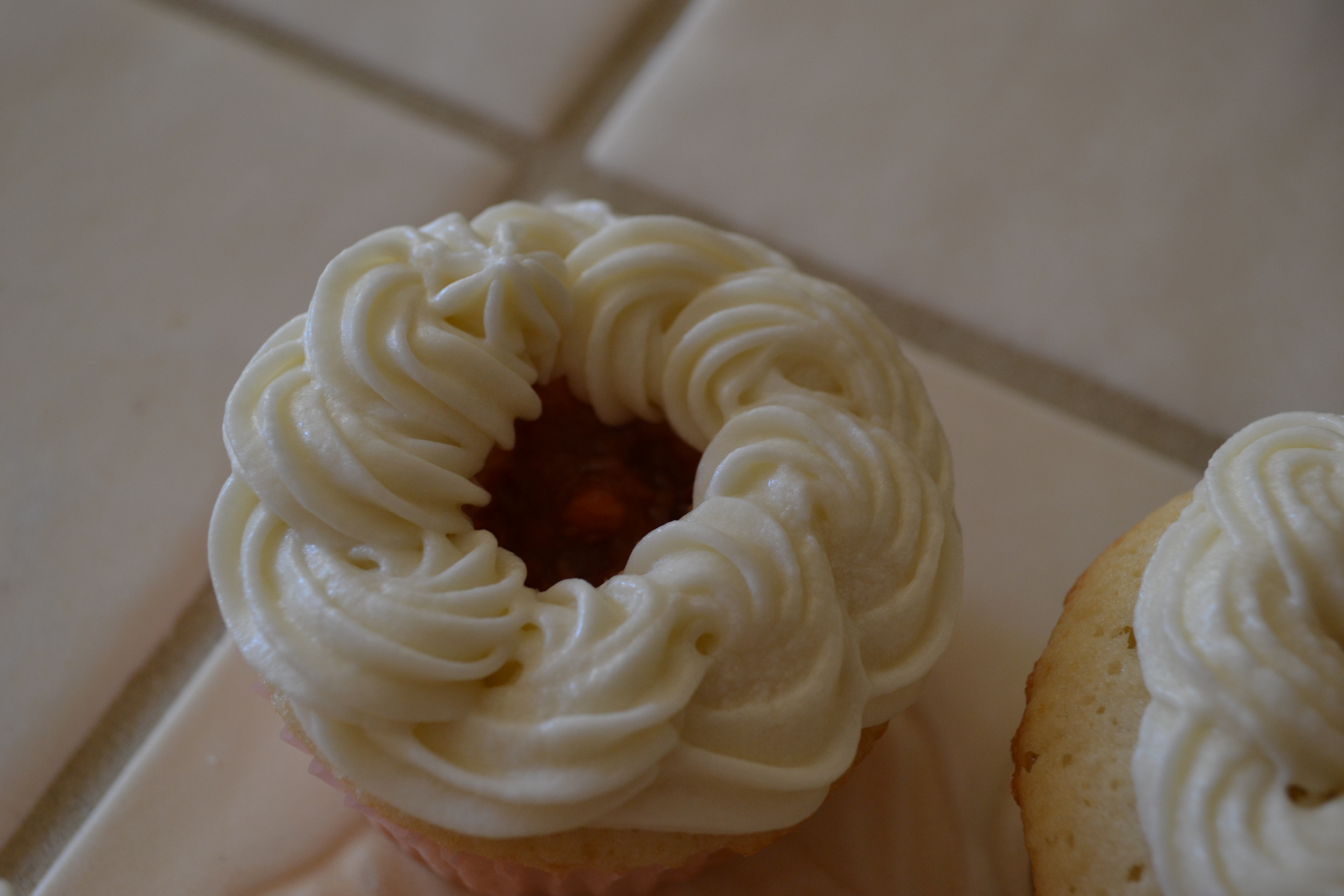 With regular instead of cake flour, the baking time needed to be increased by a minute or two (science-types: why might this be? Does it take longer for regular flour to absorb liquids than cake flour?), and in my impatience, a few of the cupcakes fell in the middle and remained a bit gummy. Initially this upset me, but the wonderful thing about filling is that you hollow out the center of the cupcake, which eliminated any underbaked batter completely.