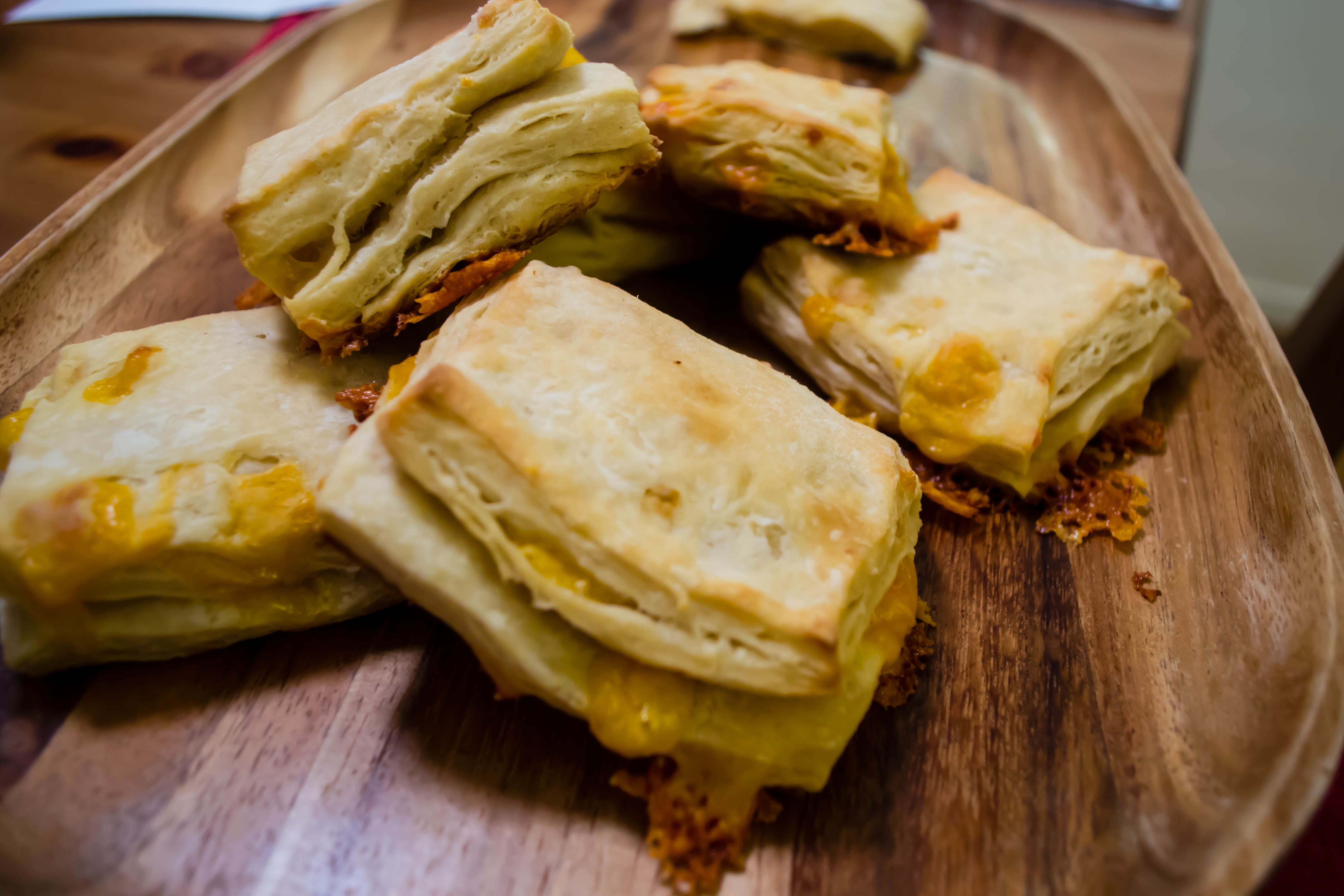 We ate these as an accompaniment to a honey mustard roasted acorn squash and chicken apple sausages. I know, I had to get the apple back in there somehow. My assessment? They were delightful. The exterior was flaky and crisp, and I was impressed by how the layers really did make a difference in the texture of the biscuit: they were moist and chewy and distinct. The cheese wasn’t as noticeable as I’d thought it would be, though the crispy edge bits were lovely – much like the lacy brulée that adorns the outside edges of a good cheese bagel. At first I thought I couldn’t taste the brown sugar at all, but as I took my third and fourth bite, gasping around the steam, I realized that the complex lingering warmth at the end of each bite was probably the effect of the brown sugar. It carried the depth and richness of a caramel without being sweet.