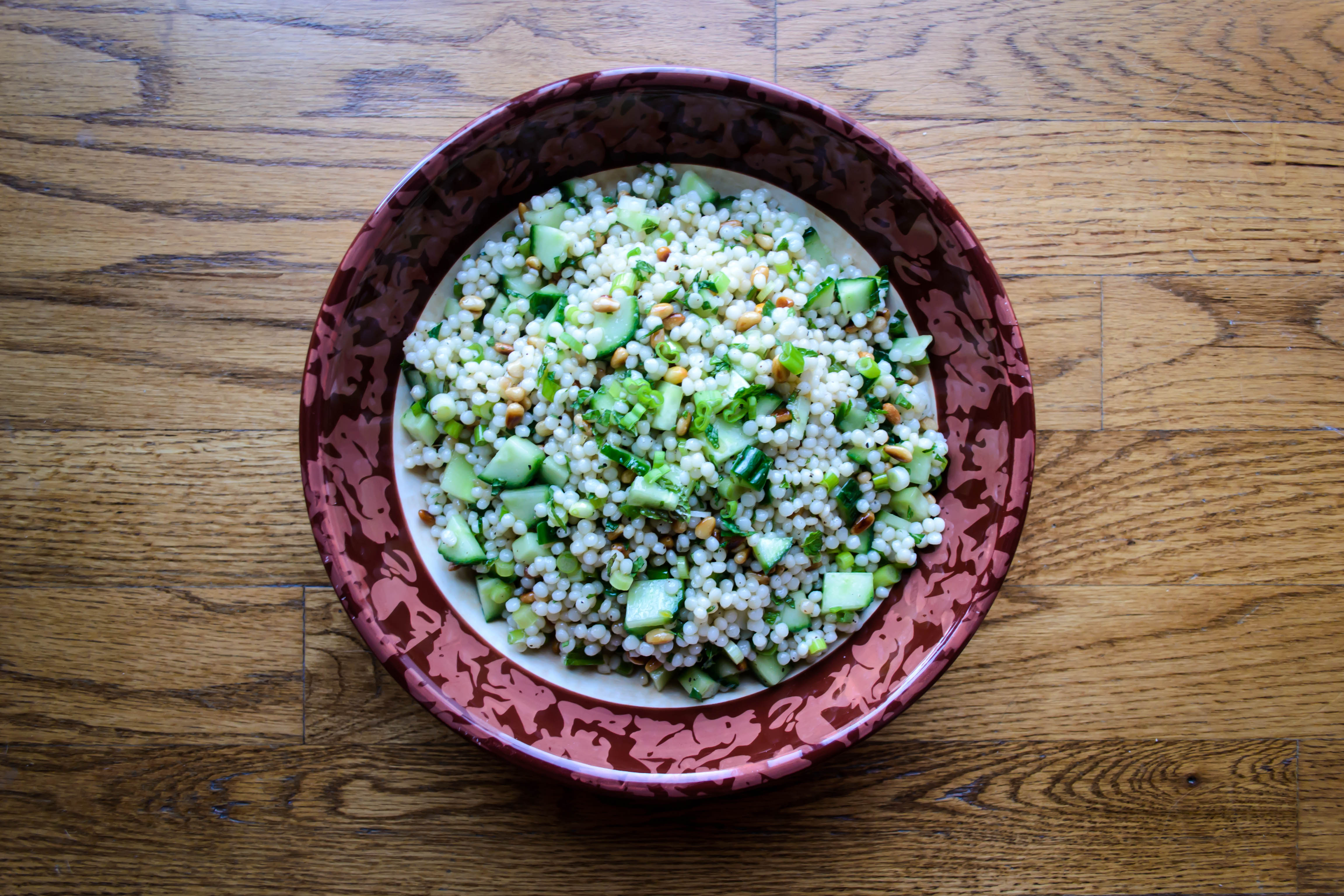 This simple Israeli couscous salad was born of a vision of combining raita and tabbouleh, though bizarrely with none of the most important ingredients for either. But that’s me. I’ve stripped away the parsley and the yogurt and the tomatoes and the bulgur wheat, and wound up with a collection of flavors and textures I’m totally in love with. And it’s so simple. Israeli couscous. Cucumber. Green onions. Mint. Pine nuts. Olive oil and lemon juice to dress. That’s it.