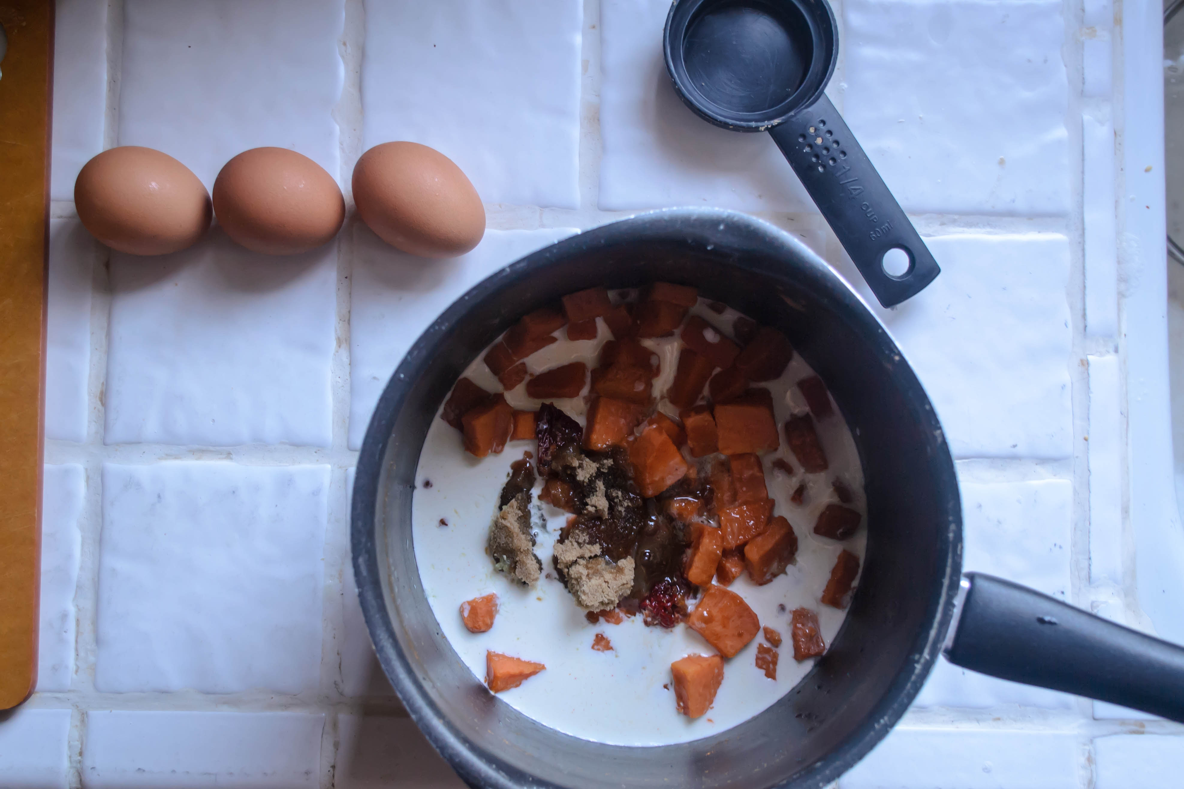 • Drop your peeled sweet potato cubes in boiling salted water and cook until they are very tender but not yet falling apart. Drain and set aside to cool.