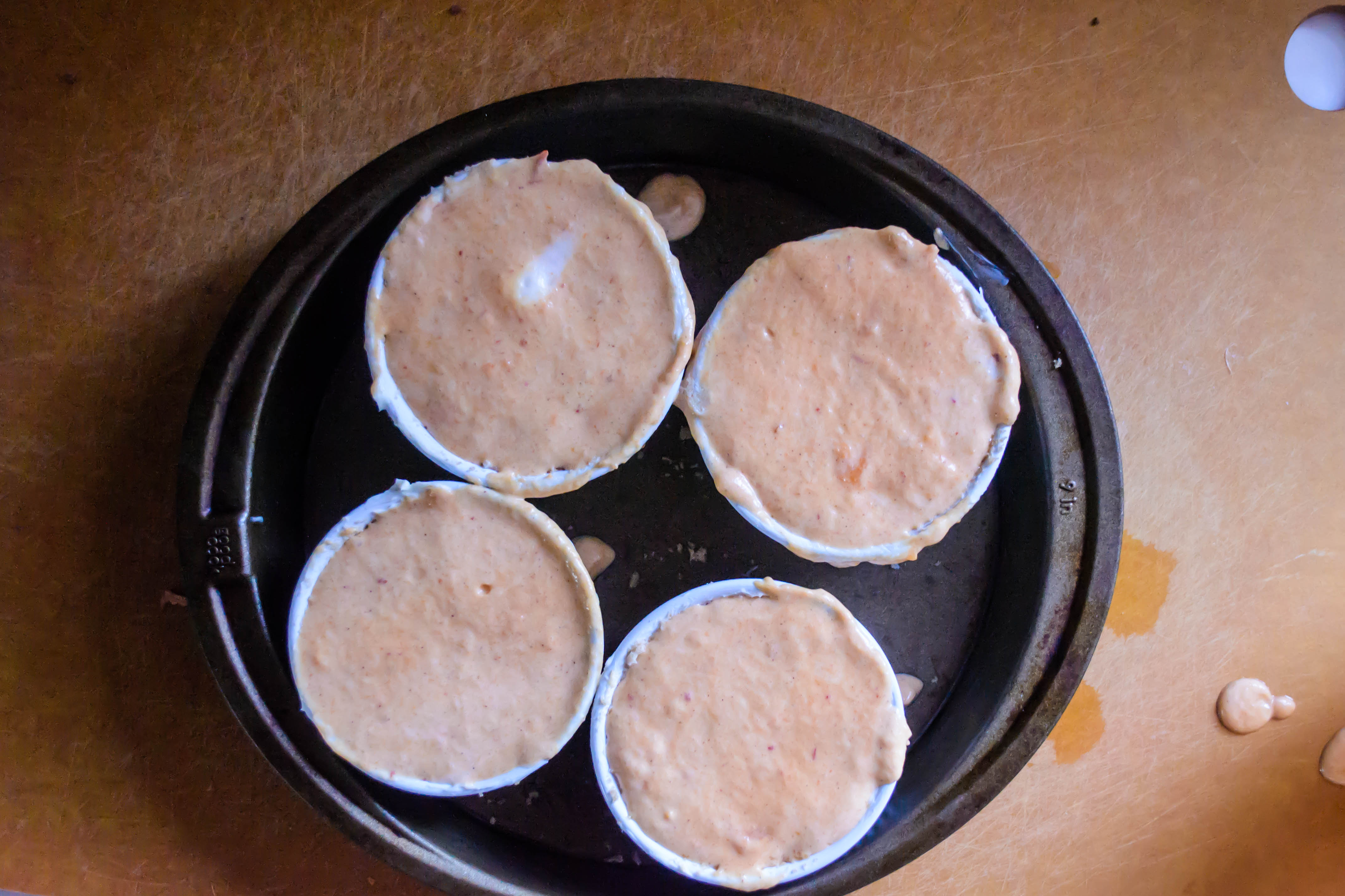 • Retrieve your frozen ramekins and fill each with the soufflé mixture, being careful not to let it plop from too high (in case of deflation). When each cup is full, smooth off the top – this seems fussy, but it will aid in even rising.