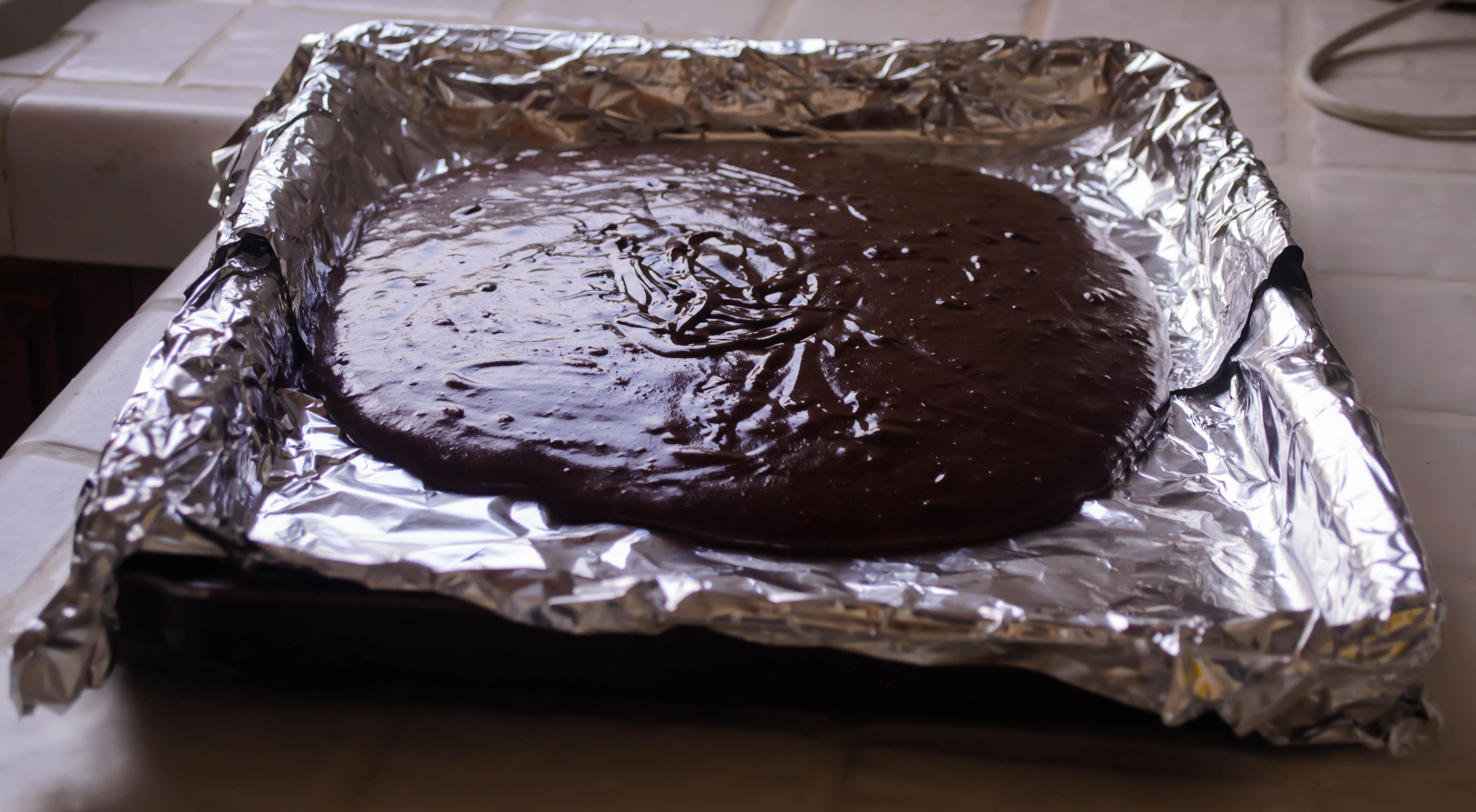 - Dump and spread the batter over the prepared pan to create a thin, even layer. You may have to manipulate it quite a bit to get it to spread that far.