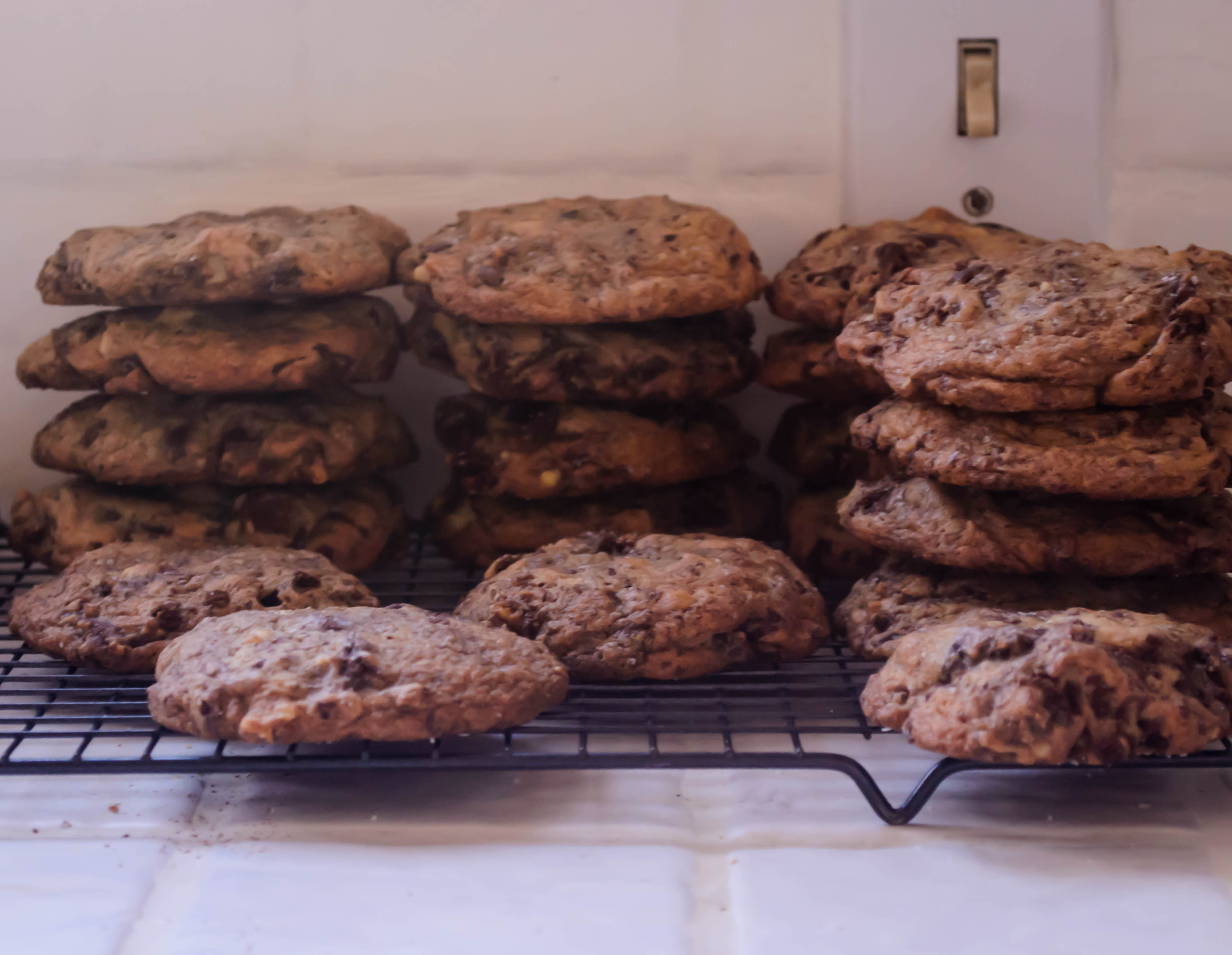 Despite my self-effacing proclamations of cookie-production-failure last week, earlier this week I pushed through my grading, closed down the semester (email? What email?), and made another batch of cookies. These, while not Christmas or holiday themed, per se, are a cookie I’ve been playing with for some time now, and the final result is so big, so decadent and comforting and butter laden and jammed with chocolate, that not including them on a holiday cookie platter feels unacceptable. Unless, of course, that’s because you ate them all before you had a chance to assemble that platter. In which case, carry on. I think you’ve got the right idea.