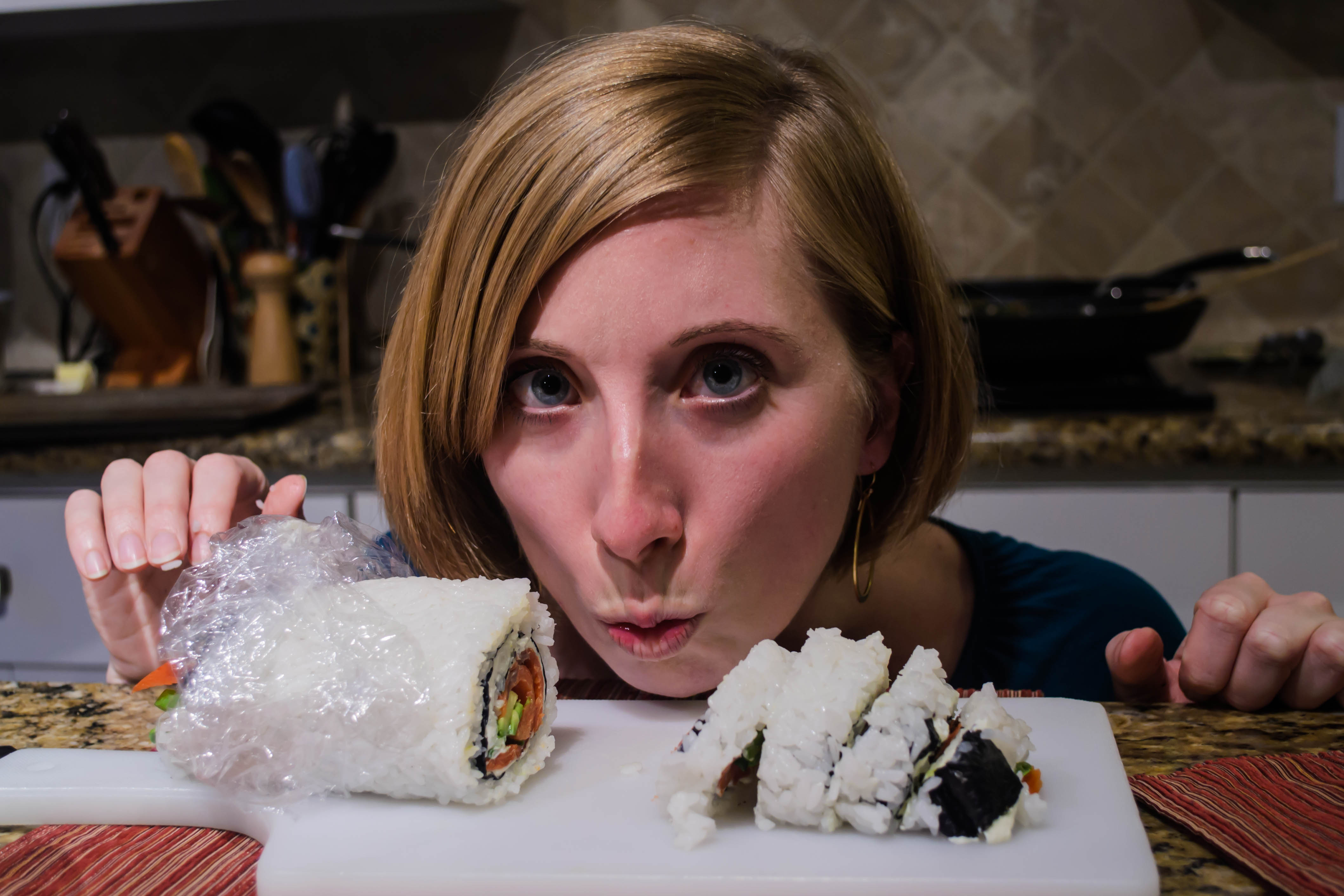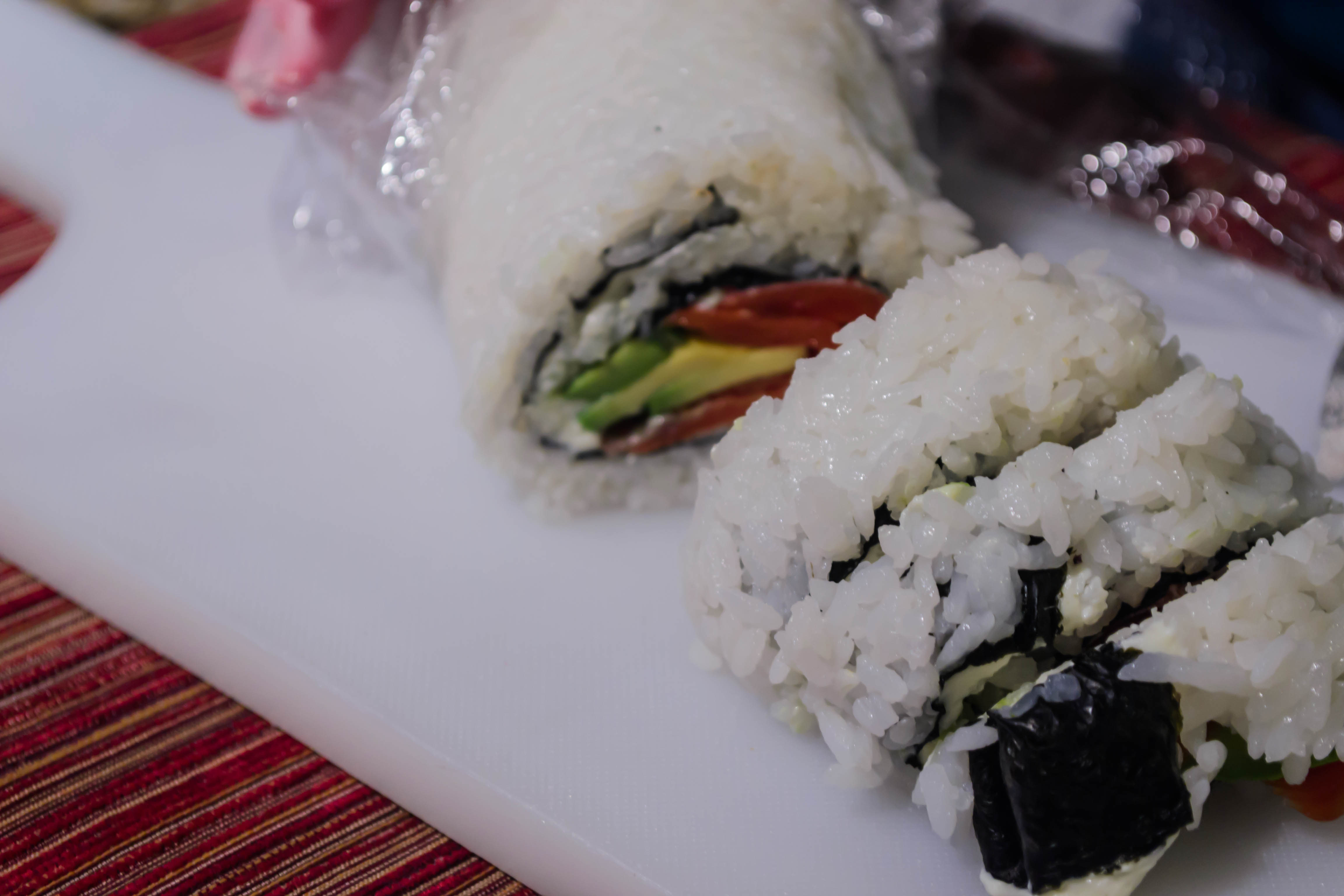 My sister and I are completely virgin sushi rollers, so we didn’t really know how much filling to include. This, combined with our enthusiasm for the ingredients and the anticipated end product, led to two burrito sized rolls of sushi.
